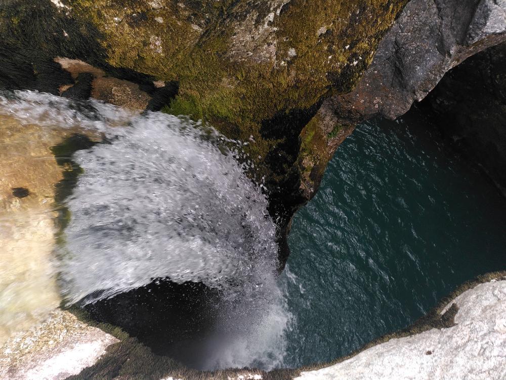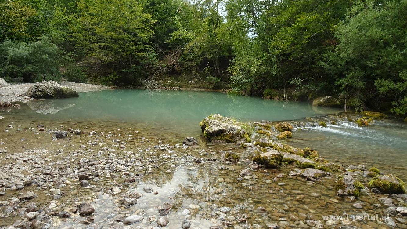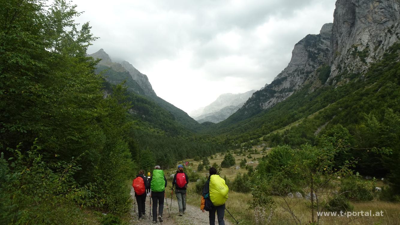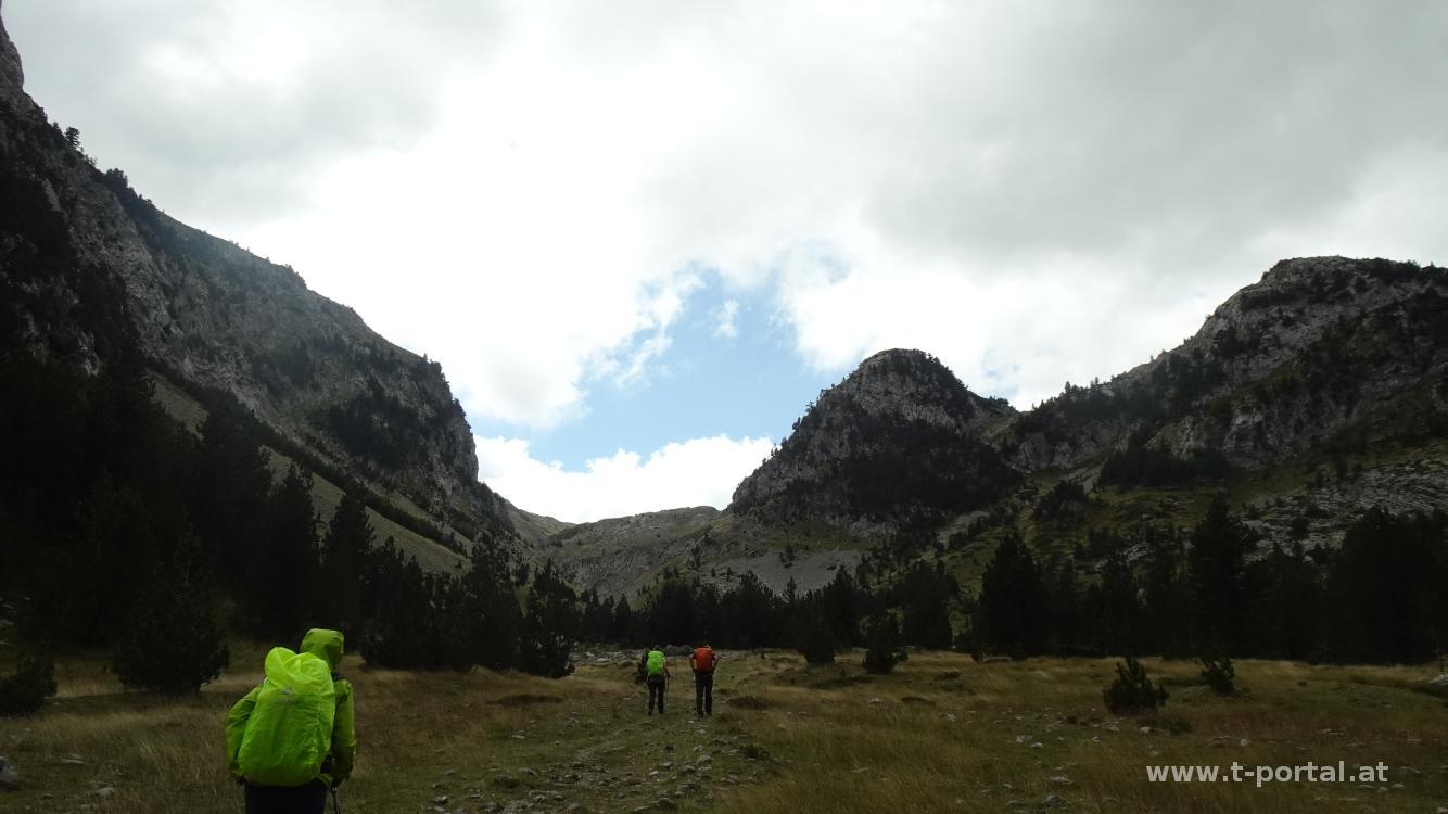 Der letzte Tag unserer abgespeckten Peaks Of The Balkans Tour führt uns von Vusanje nach Theth. Bereits am Morgen sieht das Wetter nicht all zu freundlich aus und die Wolken ziehen durch die Gegend. Wir besuchen zuerst einmal den Wasserfall in Vusanje und wandern dann auf der Schotterstraße dahin. Es ist ordentlich was los, dürfte eine der beliebesten Strecken sein. Nach etwa zwei Kilometer kommen wir zum "blauen Auge", einem trüben Minisee, etwas abseits des Wegs. Nach Kurzbesuch geht es auf der Straße weiter. Weiter vorne gibt es wieder ein Eintrittshäuschen für den Nationalpark. Zwischendurch tröpfelt es uns etwas an, hält aber nicht lang. Nach einiger Zeit auf der Straße geht es ein Stück durch dunklen Wald hinauf aufwärts und auf der anderen Seite hinab zu einem Rasplatz, bei dem schon mehrere Gruppen pausieren. Wir zischen schnell vorbei und wandern über dem ehemaligen See "Ropojansko Jezero" vorbei, der inzwischen ausgetrocknet ist.