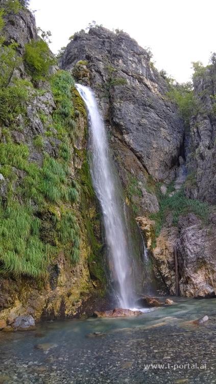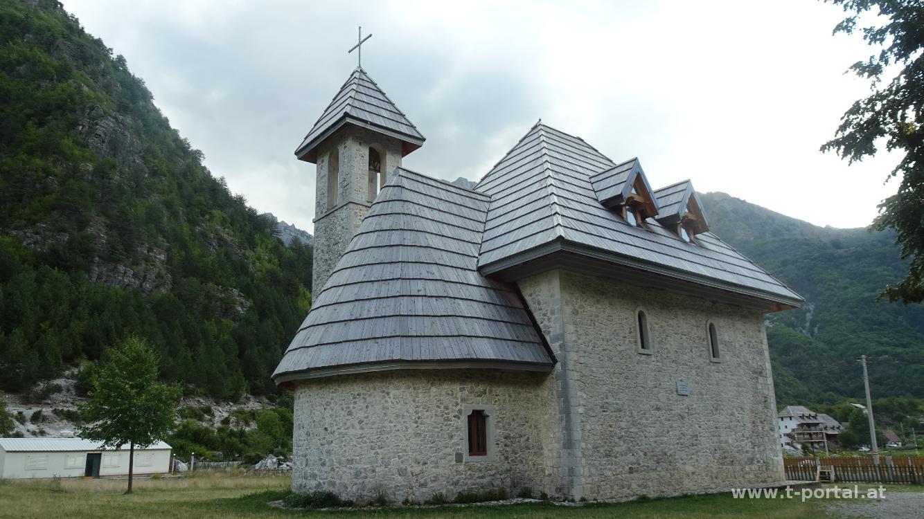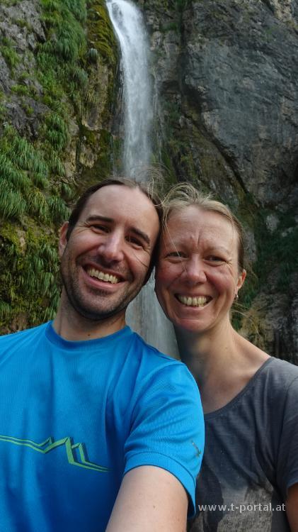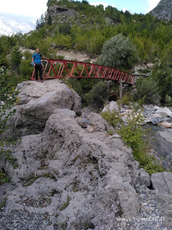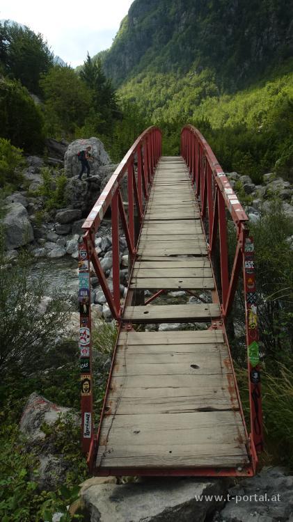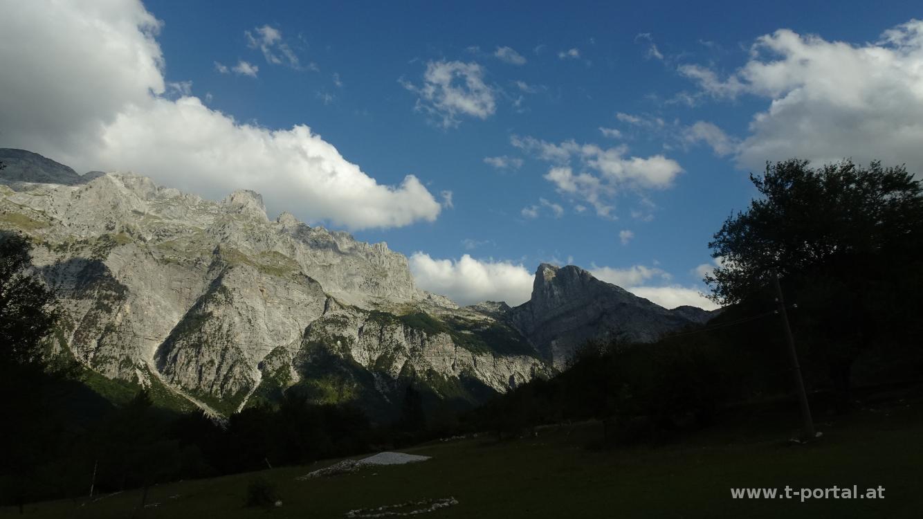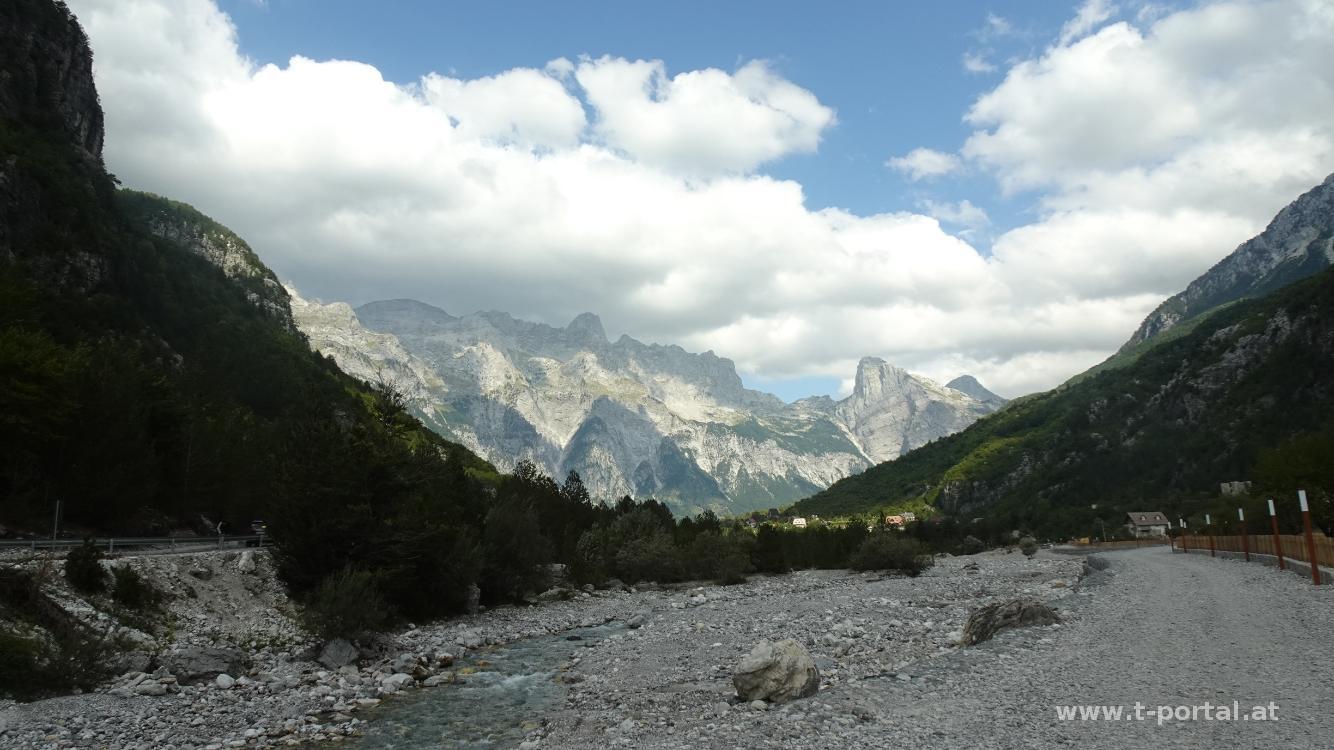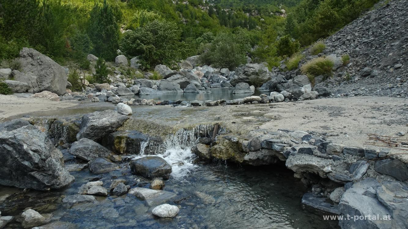 Bevor wir mit dem Bus zurück nach Shkodra fahren, wollen wir in Theth noch den Wasserfall besuchen. Wie wir erfahren haben, fährt der Bus aber schon um 11:00, also schauen wir, das sich die zweistündige Tour in weniger Zeit ausgeht. Von unserm Quartier geht es auf der Schotterstraße bis nach Theth, hier haben wir dann noch 1h50 Zeit bis die Busse angeblich fahren. Also wandern wir schnell weiter durch den Ort, bis zur Kirche, vorbei an weiteren Guesthouses und zurück zum Bach. Es geht rumpelig bergab, über einen Bach und auf der anderen Seite wieder hinauf zum nächsten Guesthouse. Auf schmaleren Pfaden geht es nun weiter und vom Wegweiser etwas steiler hinauf bis zum Wasserfall.