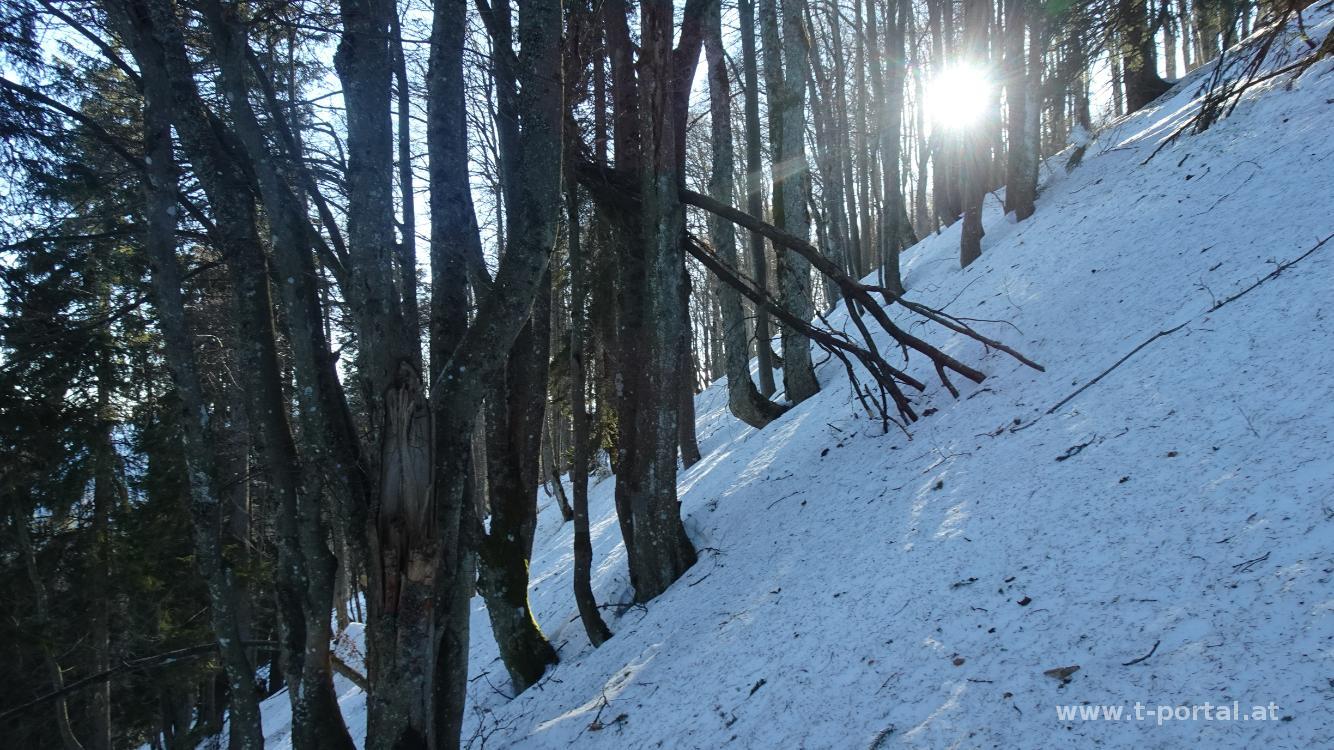 Wir nutzen das schöne Wetter für eine Tour auf die Reisalpe. Von der Ebenwaldhöhe geht es auf der Straße hinab zur Kleinzeller Hinteralm in den Sonnenschein. Von dort bald über Schnee weiter über die Wiesen und durch den Wald hinauf. Die aktuelle Winterwanderspur führt im Schlussanstieg deutlich weiter links als der Normalweg hinauf zur Hochfläche.