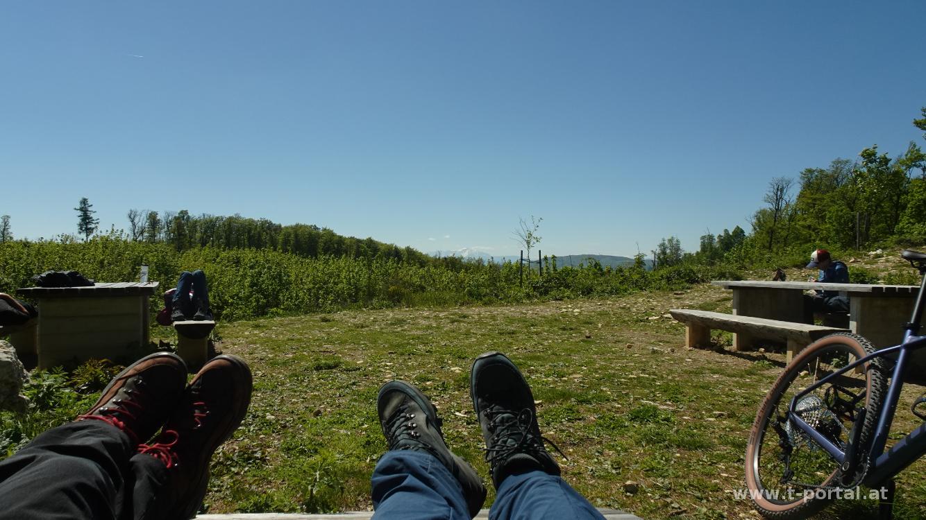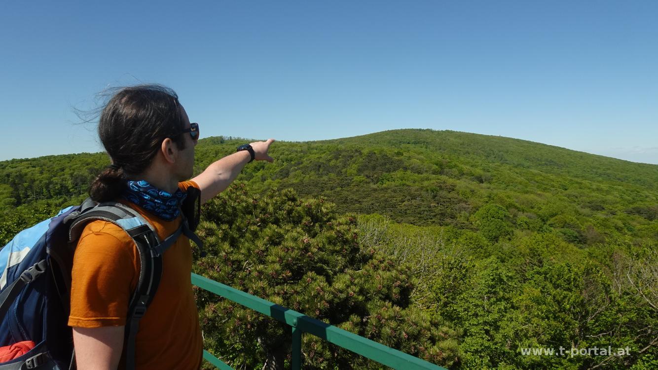 Anschließend liegen hier wir mit Ausblick noch etwas in der Sonne, dann geht es ein Stück retour, auf der Straße weiter und bald nach links zur Wilhelmswarte. Der Weg führt uns zurück zur Straße aber bald nach links und durch warmes Gebüsch hinab zur "Drei Eichen" Kreuzung. Nun recht lang entlang eines eingezäunten Gebiets (Jagdgut Waldhof laut OSM) hinab, bevor es nochmal ein Stück hinauf geht, wo wir dann den Pfaffstättner Kogel mit Rudolf Proksch Hütte und Klesheimwarte erreichen.
