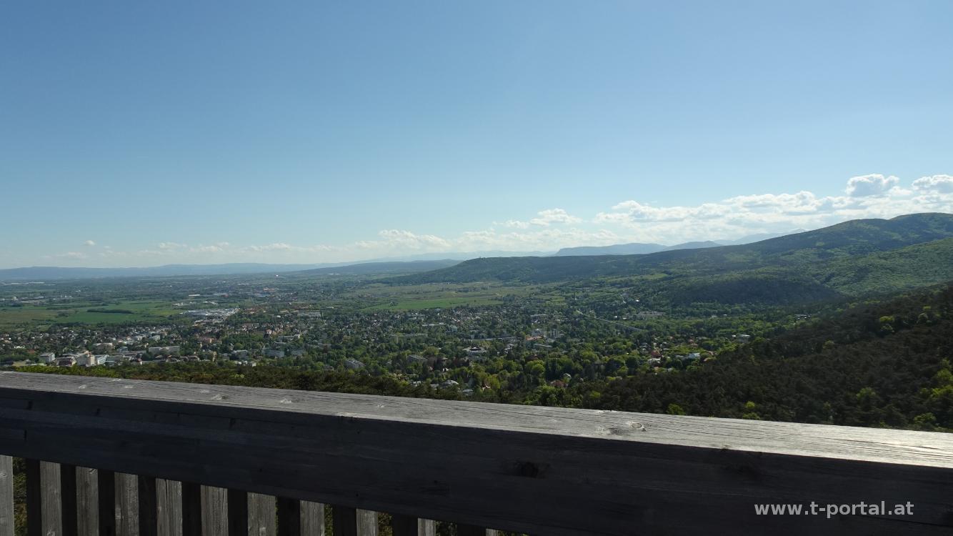 Nach der nächsten Aussicht gehen wir auch gleich weiter und ordentlich hinab bis wir in der "Einöde" die Landesstraße queren. Auf der anderen Seite geht es im Wald auch gleich wieder hinauf und bald wieder auf Forsstraßen dahin. Wir biegen nach rechts ab um weiter vorne links zur Theresienwarte zu kommen. Auch hier gönnen wir uns noch eine Aussicht, bevor es durch den Kurpark hinab nach Baden und zum Bahnhof geht.