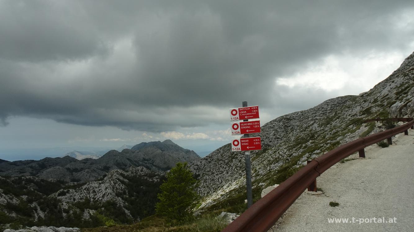 Wir haben unser Quartier noch etwas nach Süden verlegt und fahren heute in den Biokovo Nationalpark. Auf einer Mautstraße (Tickets online reservieren, je nach Saison auch schon ein paar Tage zuvor) geht es hoch in den Nationalpark. Wir folgen der Autoschlange bis zum ersten Aussichtspunkt mit Skywalk und fahren dann noch bis fast ganz hinauf zum höchsten Punkt (Sveti Jure 1762m). Etwas darunter (bei der Planinarska Kuca Sv. Jure) parken wir und starten unsere Wanderung. Das Wetter sieht etwas nach Regen aus, wir schauen einfach mal, wie weit wir kommen.