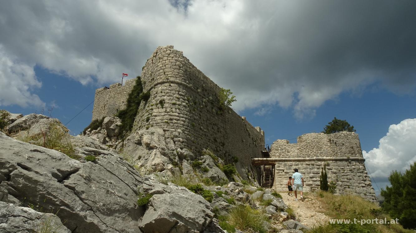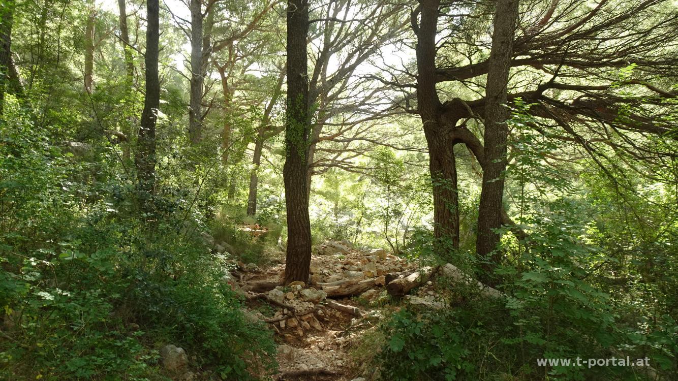 Bevor wir die Heimreise antreten besuchen wir am Weg nach Norden noch Omiš und wandern hier hoch zur Festung Stari Grad. Vom Dort geht es etwas entlang des Cetina Flusses (hier gibts zahlreiche Ausflugsboote) vorbei an einem Tunnel und bei einem Parkplatz nach rechts in den Wald. Hier geht es gleich zackig steil bergauf über viele Felsen. Der Weg schlängelt sich durch den Wald und wir kommen schnell ins Schwitzen.
