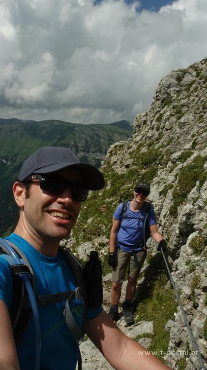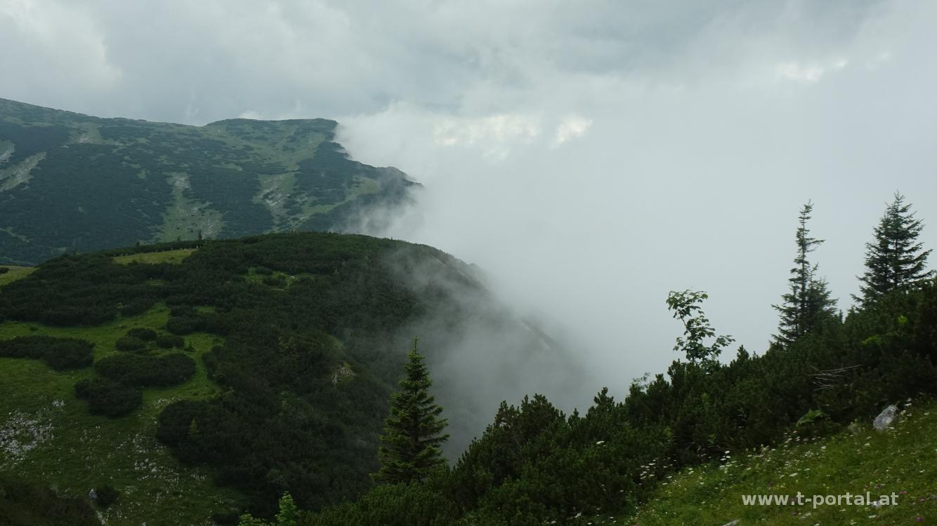 Wir folgen den Tritten in der Rinne hinauf bis zu den zwei Leitern, die uns rasch weiter nach oben bringen. Es folgt wieder Gehgelände und wir treffen auf eine Gruppe des Alpenvereins Sattledt, die gestern über die Wildfährte aufgestiegen ist und heute hier absteigt. Nach dem Gehgelände durch ein paar Latschen folgt nochmal ein seilgesichertes Stück, dass uns in einigen Kehren weiter hinauf führt. Dann haben wir die Latschen auf der Hochfläche erreicht. Wir gehen noch ein Stück weiter und finden in der Nähe der nächsten Wegkreuzung einen windgeschützten Rastplatz. Während wir unsere Jause verdrücken blicken wir rüber zur Schneealpe, über das Raxplateau und fragen uns, was wohl aus den herumziehenden Wolken wird.