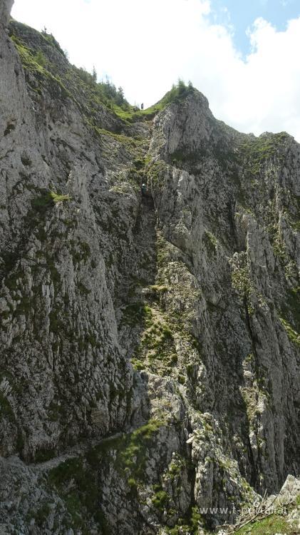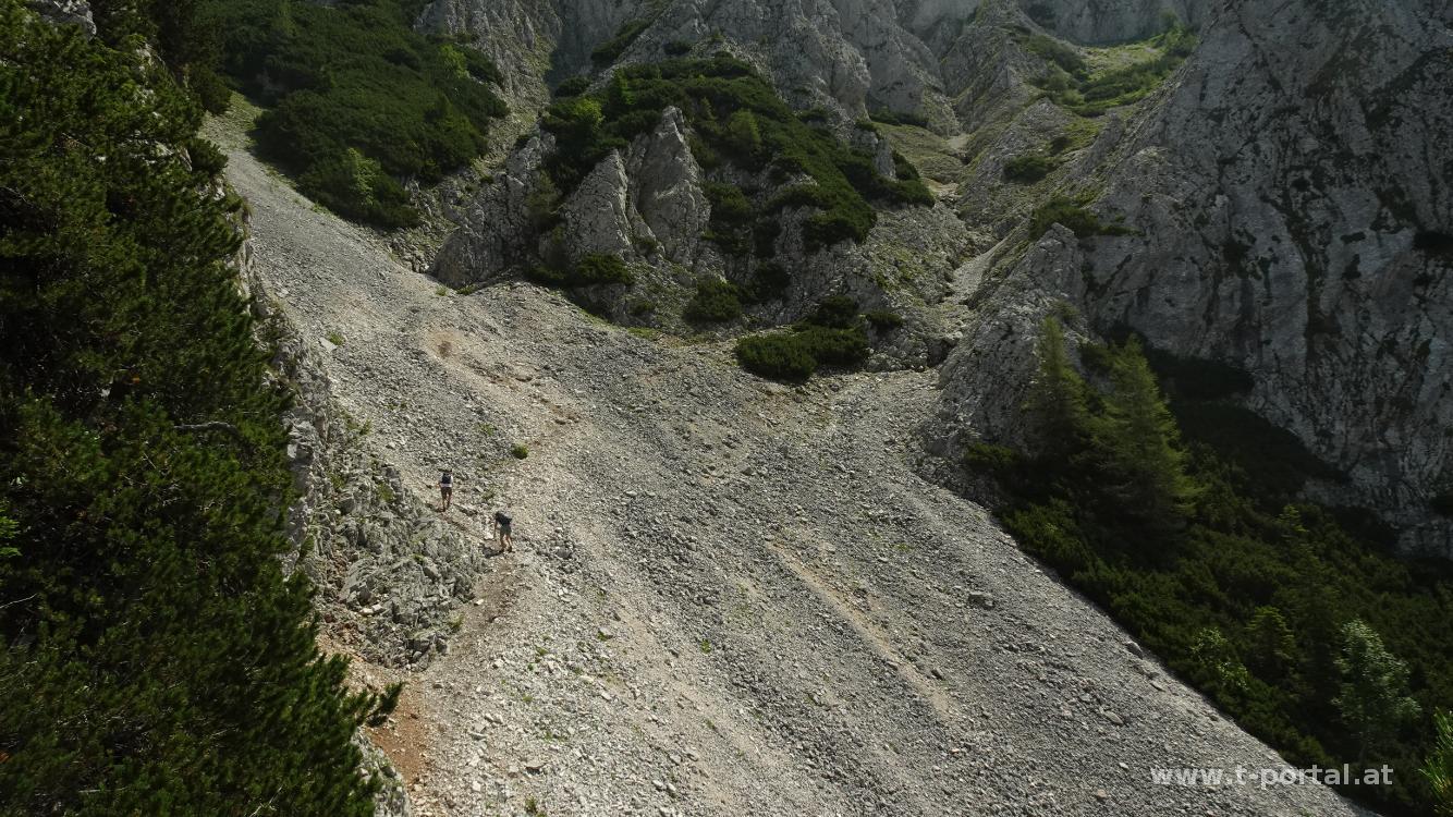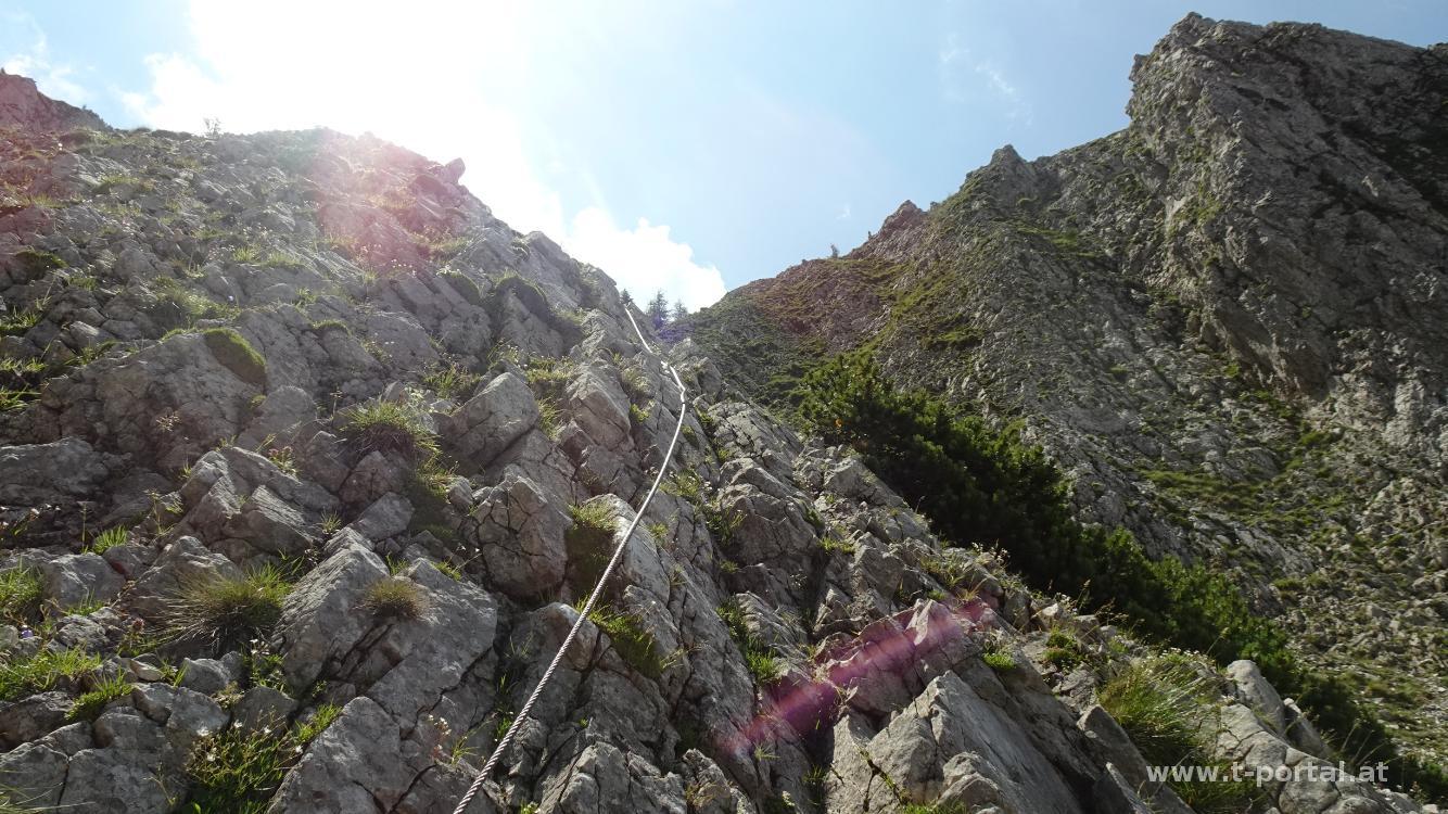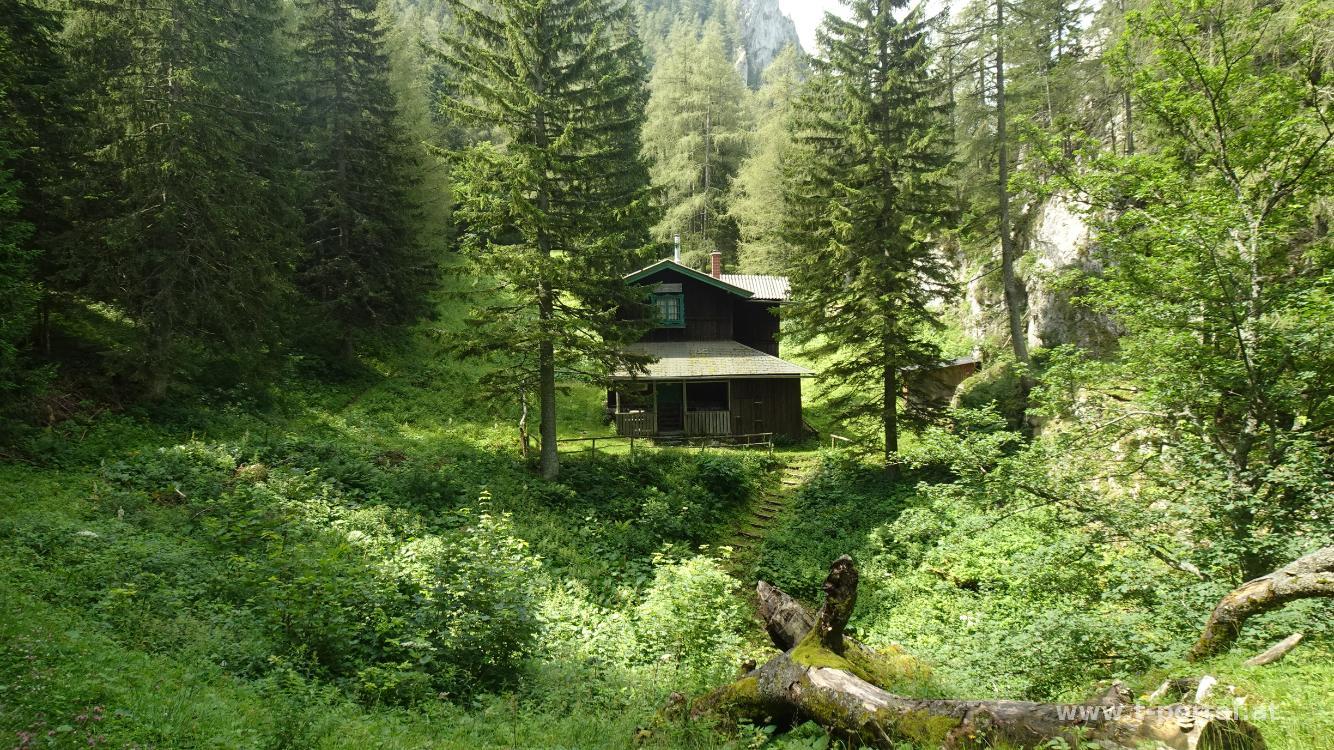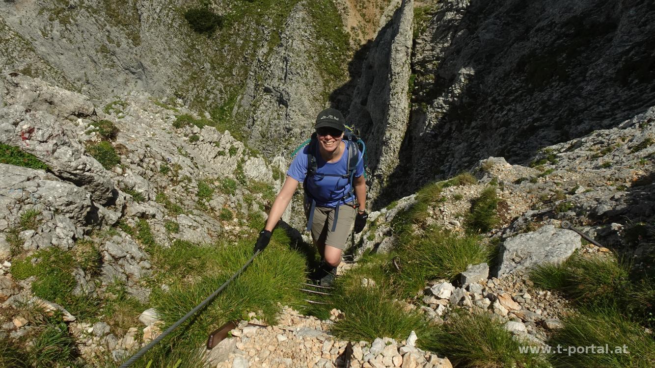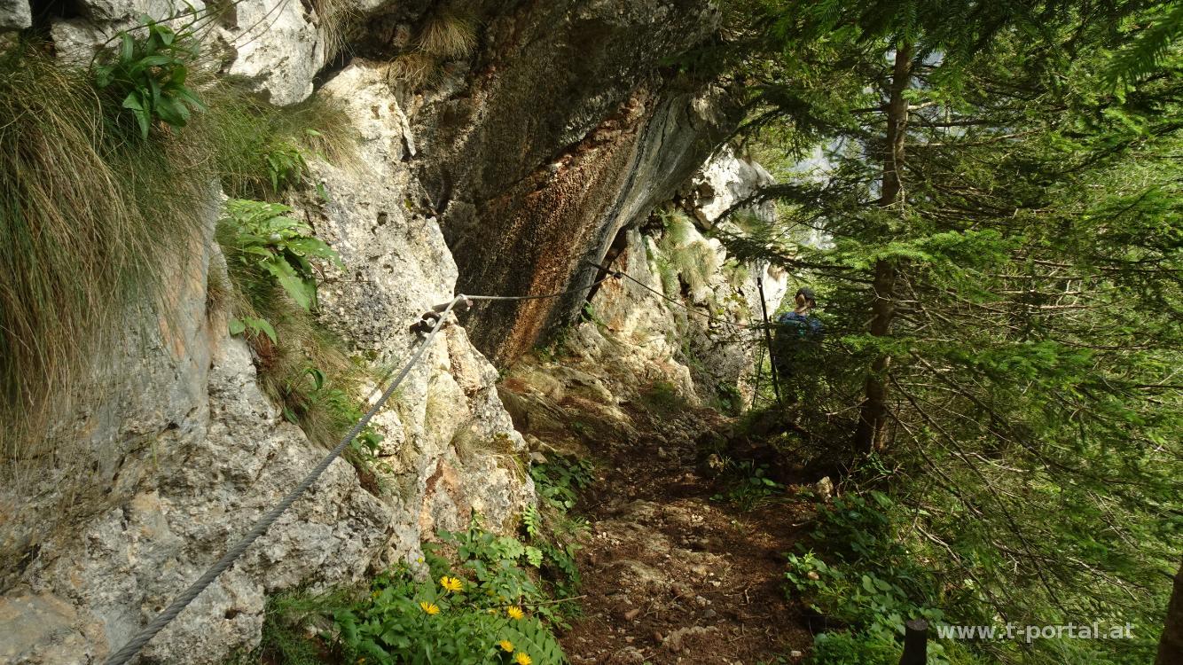 Wir kommen an den Resten der Zimmermannshütte vorbei, die inzwischen zusamengefallen ist (wurde). Ein Stück weiter vorne sehen wir schon die Gamseckhütte (privat, unbewirtschaftet) und legen auf einem nahem Rastplatz eine kurze Pause ein. Anschließend geht es auf teils feuchten Wald und Felspfaden weiter aufwärts bis zum Gupfsattel. Hier geht es nach rechts steil hinauf auf den Grabnergupf und nach links zum wilden Gamseck (Kletterei in Schwierigkeit zwei). Wir gehen geradeaus weiter am Gamsecksteig. Zuerst geht es noch ein Stück durch den Wald und dann wird das erste Schuttfeld gequert. Anschließend durch den nächsten Waldhang und ins nächste Schuttfeld. Dieses ist nun steiler und man quert (je nachdem wie die Steine gerade ausgetreten sind) einmal hin und her, um Höhe zu gewinnen. Danach erreicht man die ersten gesicherten Stellen, wo wir auch unsere Wanderstöcke an den Rucksack packen. Entlang des Drahtseils geht es nun in leichter Kletterei aufwärts. Anschließend folgt etwas steiles kreuz-und-quer Gehgelände. Nach dem nächsten Anstieg sieht man (wenn man es weiß) gegenüber schon die Leiterpassage. Vorher geht es aber über feinen Stein leicht bergab, nach rechts, dann nach links um ein Eck und dann wieder hinauf. Hier kommen uns auch schon einige Wanderer im Abstieg entgegen.
