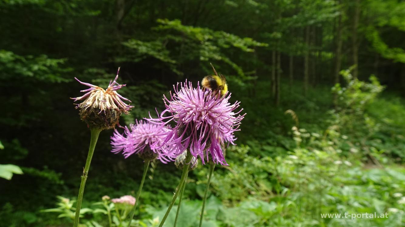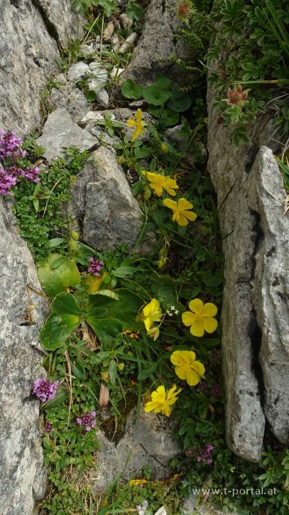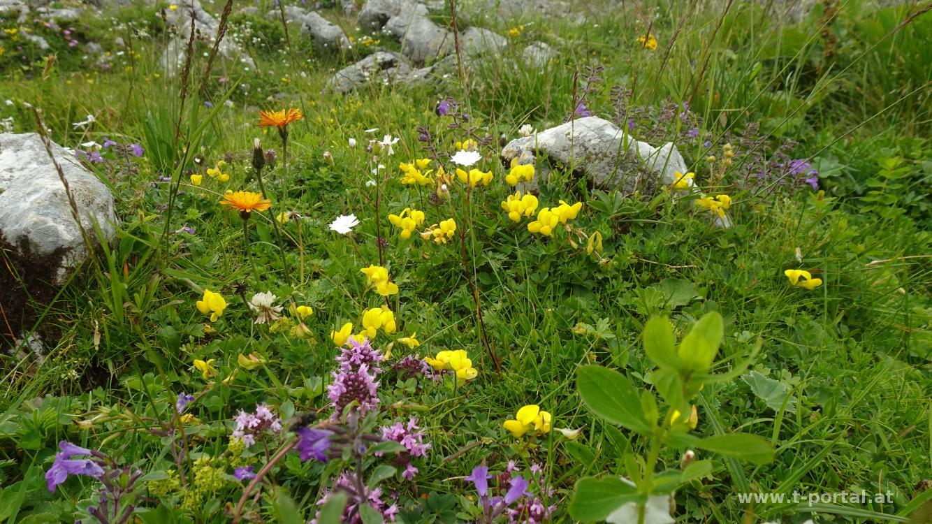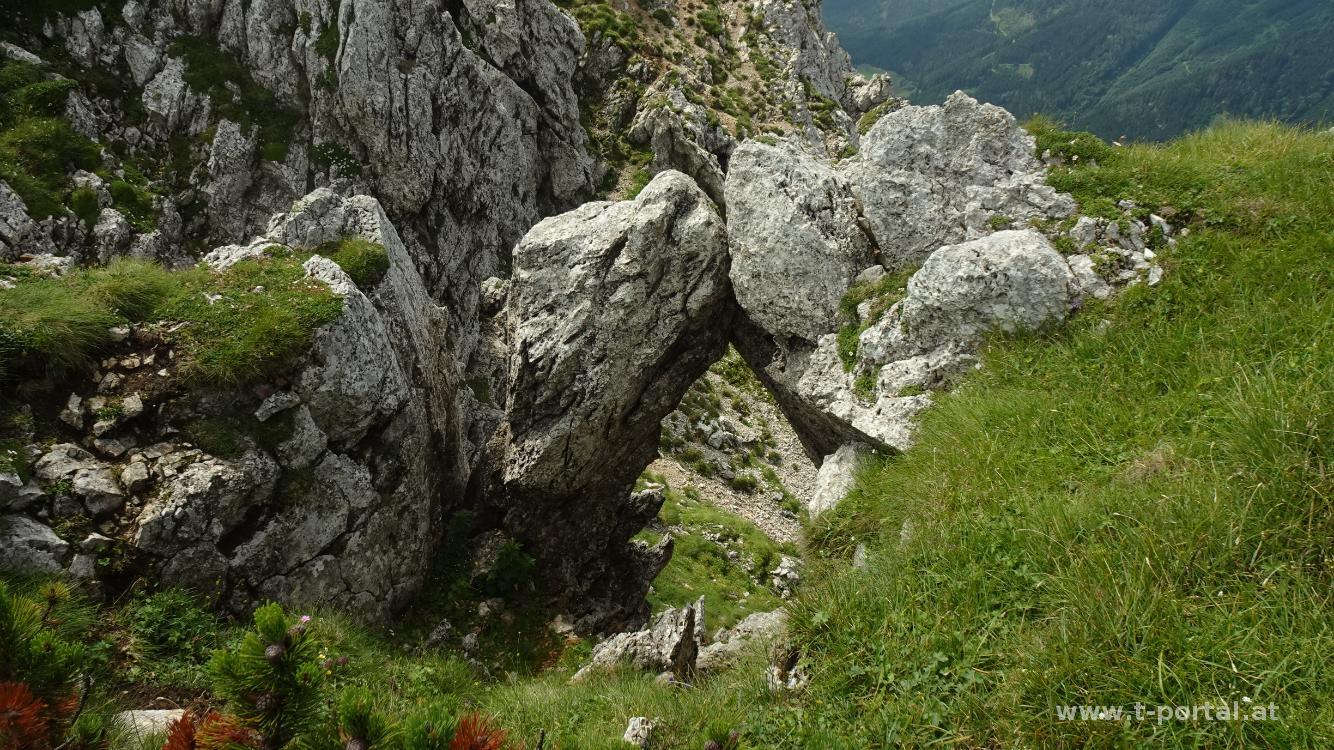 Nach der Rastpause besuchen wir noch den nahegelegenen Gamseckgipfel und das Felsenfenster in der Nähe. Anschließend geht es über die Wiesen-Wanderpfade hinab zur Grasbodenalm und zum tiefsten Punkt bei der Kreuzung mit dem Bärenlochgraben. Nun heißt es nochmal Kräfte mobilisieren und vorbei an Blumen und Latschen wieder hinauf wandern. Wir treffen noch eine Gämse und wandern dann über die Wiesen zum Wanderweg, der uns recht bald zum Habsburghaus bringt. Hier lernen wir wieder mal, dass dies am Sonntag gar nicht so lange offen hat, für einen Kuchen und ein Getränk ist aber noch genug Zeit. Währenddessen ziehen immer Wolken aus dem Tal hoch und neben spannenden Fotos bringt das auch ein paar Regentropfen.