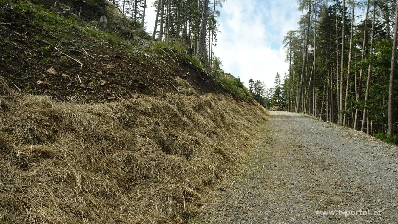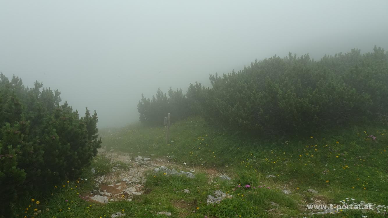 Mit wenigen Metern Sicht beginnen wir den ersten Abstieg, nach ein paar Minuten reißt es aber auch schon wieder auf und stellenweise kommt nochmal die Sonne durch. Am Kaisersteig geht es nun über zahlreichen Schotter hinab ins Tal. Nach einer Wiesenquerung folgt das steile Stück mit ein paar Sicherungen und losem Schotter. Weiter unten wird es dann wieder mehr verwachsen und kurz bevor wir die Straße erreichen hat wohl kürzlich der Regen den Weg etwas weggeschwemmt. Vorbei an den Wegweisern zu Wildfährte und Bärenloch führt uns die Straße zurück zur Materialseilbahn und von dort entlang des Bachs zurück zum Ausgangspunkt.