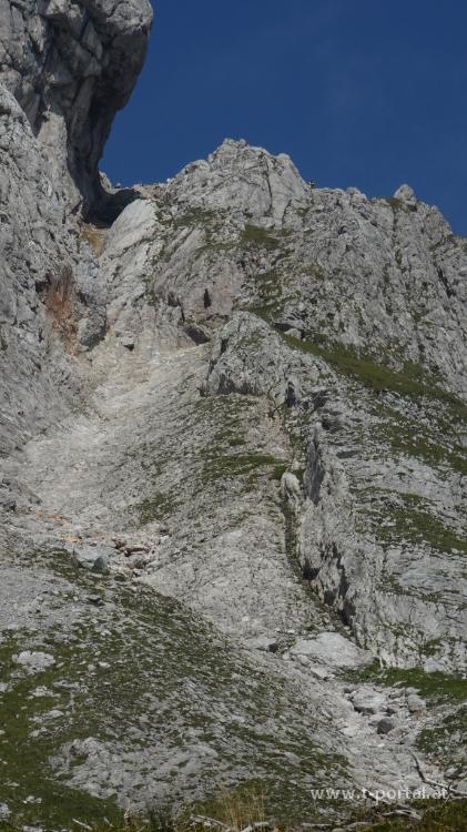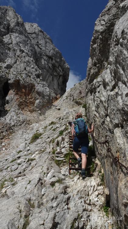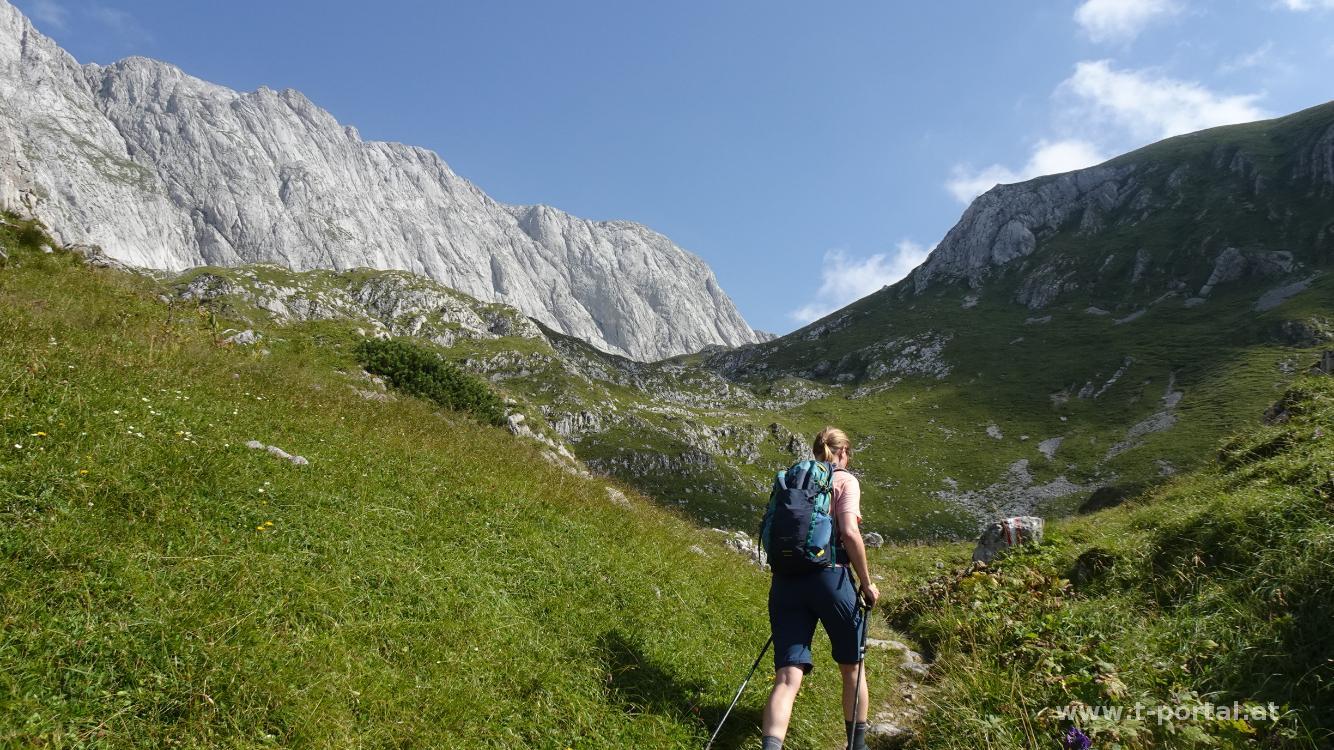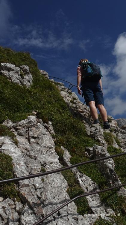 Der Weg wird bald wieder steiniger und über Gräben und Schuttfelder geht es in Richtung Talschluss. Bevor man jedoch am Ende ansteht, biegt der Weg nach links ab und in einigen Kehren geht es weiter aufwärts. Wir kommen immer mehr in die Sonne und mit der Anstrengung wird uns gut warm. Dafür sehen wir weiter oben dann auch schon den G'Hackstein und die Schlucht rechts davon, durch die wir aufsteigen werden. Vorher geht es aber entlang von einer Sicherung über die feuchte Felsen beim 'Vogelbad' und weiter hinauf zum Vogauer Kreuz. Nach kurzer Stärkung wandern wir die nächsten steinigen Kehren in der Wiese hinauf zum Einstieg des Steigs übers G'hackte (A/B).
