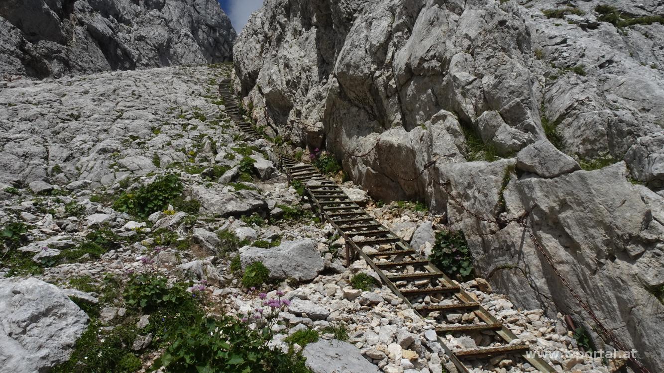 Zuerst geht es entlang von Ketten über einen Felsen, dann folgt die erste lange Leiter. Rechts neben sich hat man Felsen mit Ketten, an denen man sich anhalten kann. Nach der Leiter geht es entlang der Kette und Drahtseitle über Steine weiter aufwärts. Weiter oben geht es nochmal über eine kurze Leiter, dann wendet mans sich nach rechts und gleich wieder nach links, wo es an entlang von Metallbügel weiter steil hinauf geht. Wenn man nicht gerade aufs Steigen fokussiert ist, kann man nach rechts auf Südwand des Hochschwab blicken. Bald wird das Gelände angenehmer und wir erreichen das Ende des gesicherten Steigs. Es geht im Gehgelände noch etwas aufwärts und dann kurz hinab in einem Sattel mit Kreuz und Schneefeld neben uns. Danach nochmal ein Stück hinauf und wir erreichen das Fleischer Biwak. Von dort geht es nun flacher weiter und das letzte Stück entlang von Stangen hinauf zum Hochschwab Gipfel.
