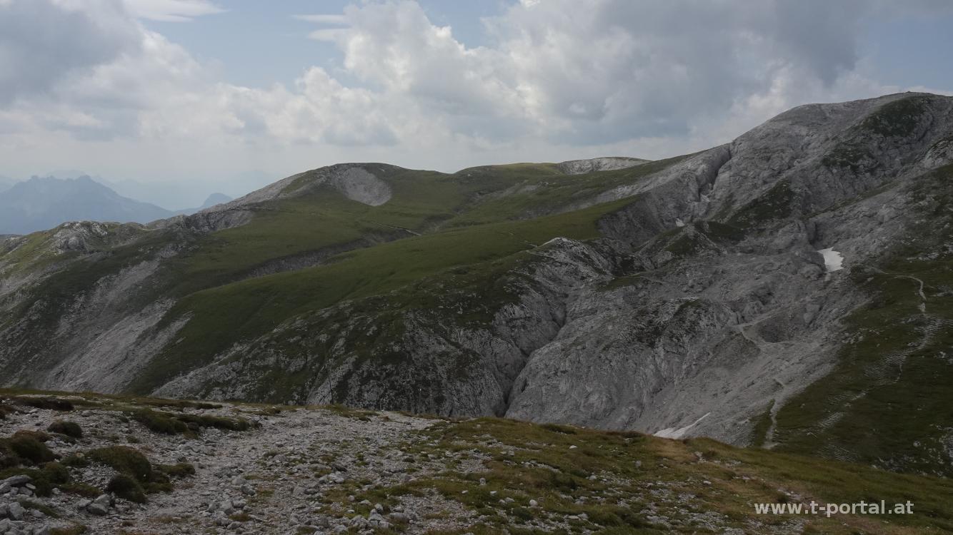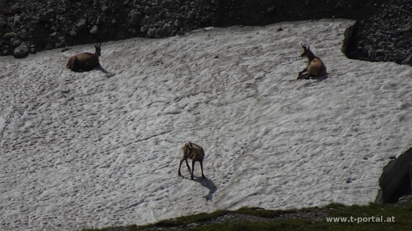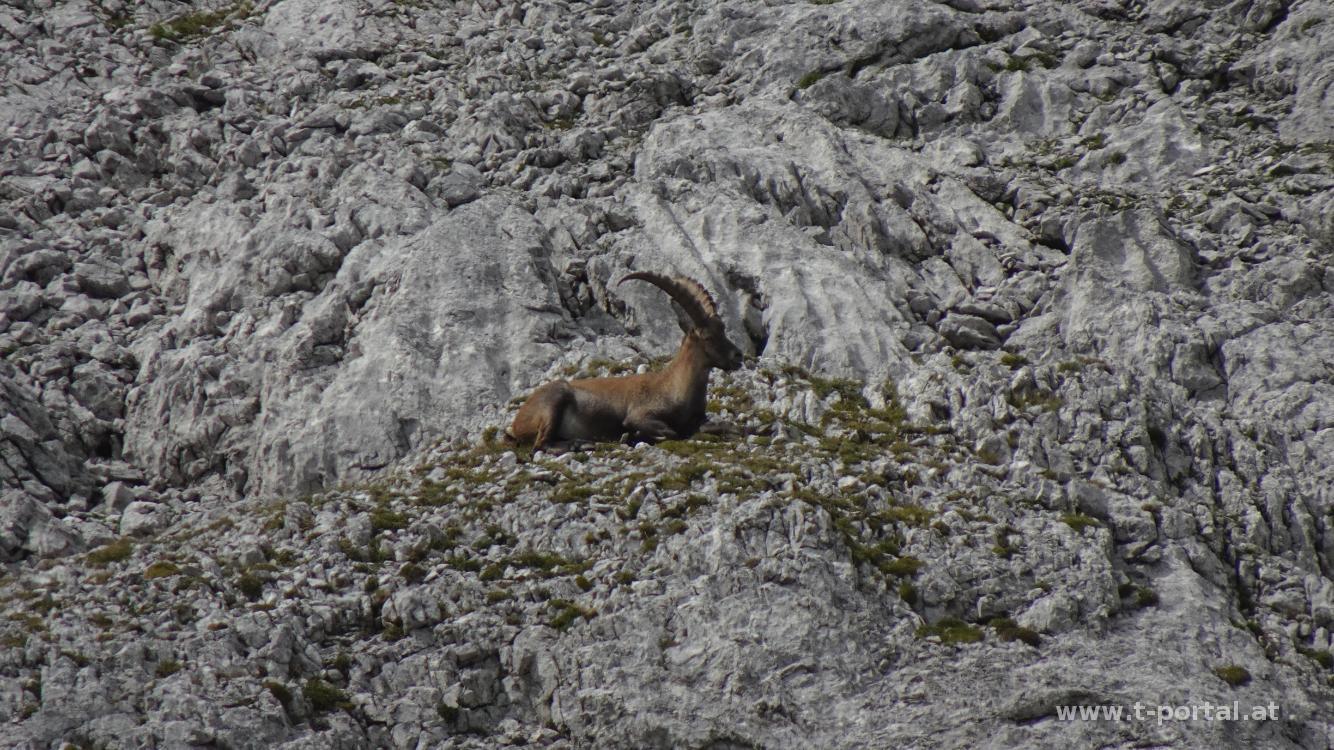 Hier legen wir eine Rastpause ein, genießen das Panorama und hören einem Hobbyfunker zu. Anschließend wandern wir hinab zum Schiestlhaus. Wie schon den ganzen Tag, ist auch hier nichts los und wir stärken uns mit einer Suppe. Nachdem das Wetter noch aushält, behalten wir den Plan bei, noch über die Hochfläche zur Häuslalm zu wandern. Vom Schiestlhaus geht es ohne Gipfelabstecher vorbei wieder auf den bekannten Weg zum Fleischer Biwak. Hier geht es nun gerade weiter etwas bergauf. Vorbei geht es am G'hacktkogel und Zagelkogel, während wir auf der rechten Seite in den Felsen die Gämsen beobachten. Es geht etwas hinab in einen Sattel, wieder hinab und vorbei an einem Schneefeld. Rechts von uns blicken wir in Richtung Hochwart und sehen hier zahlreiche Steinböcke.