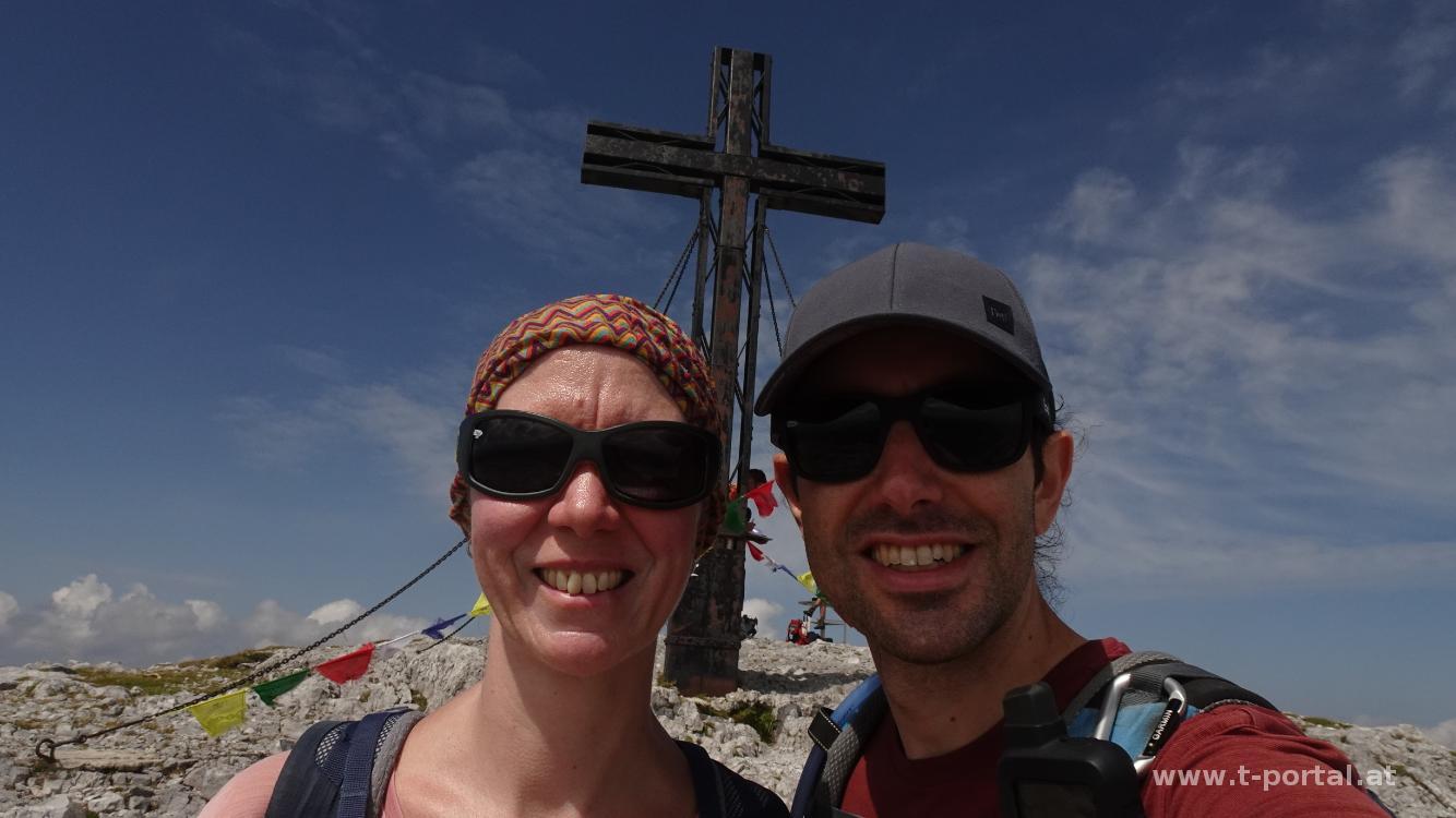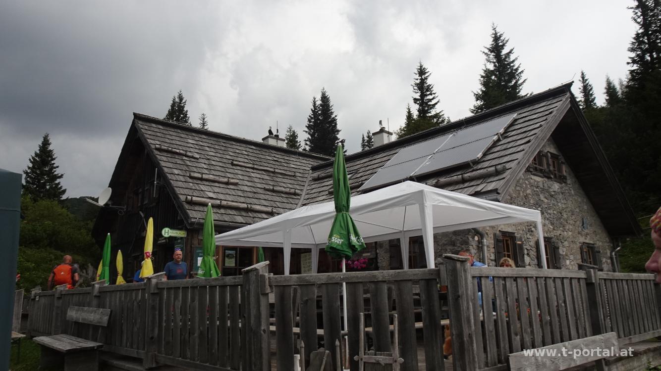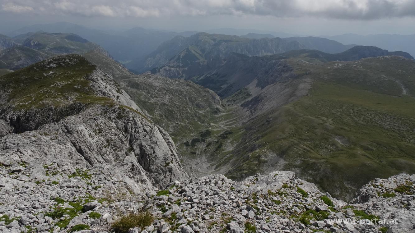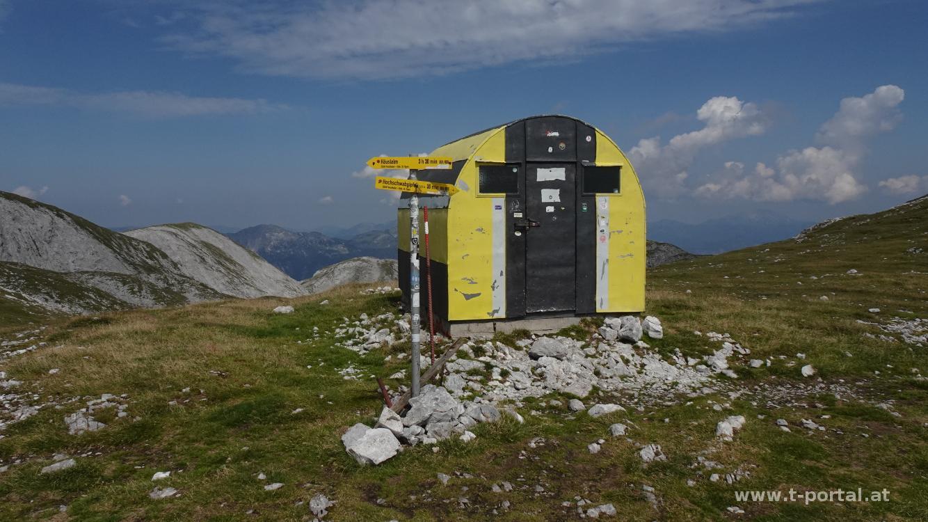 Hier legen wir eine Rastpause ein, genießen das Panorama und hören einem Hobbyfunker zu. Anschließend wandern wir hinab zum Schiestlhaus. Wie schon den ganzen Tag, ist auch hier nichts los und wir stärken uns mit einer Suppe. Nachdem das Wetter noch aushält, behalten wir den Plan bei, noch über die Hochfläche zur Häuslalm zu wandern. Vom Schiestlhaus geht es ohne Gipfelabstecher vorbei wieder auf den bekannten Weg zum Fleischer Biwak. Hier geht es nun gerade weiter etwas bergauf. Vorbei geht es am G'hacktkogel und Zagelkogel, während wir auf der rechten Seite in den Felsen die Gämsen beobachten. Es geht etwas hinab in einen Sattel, wieder hinab und vorbei an einem Schneefeld. Rechts von uns blicken wir in Richtung Hochwart und sehen hier zahlreiche Steinböcke.