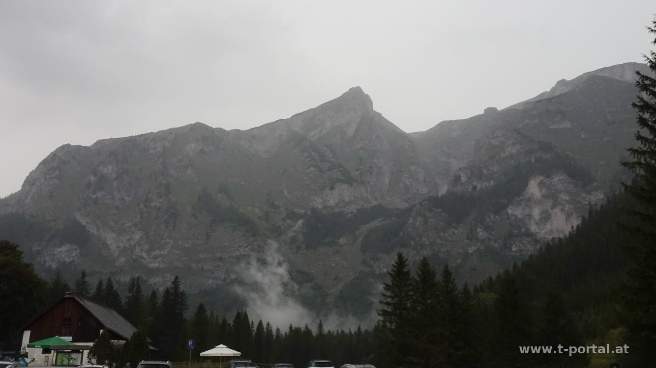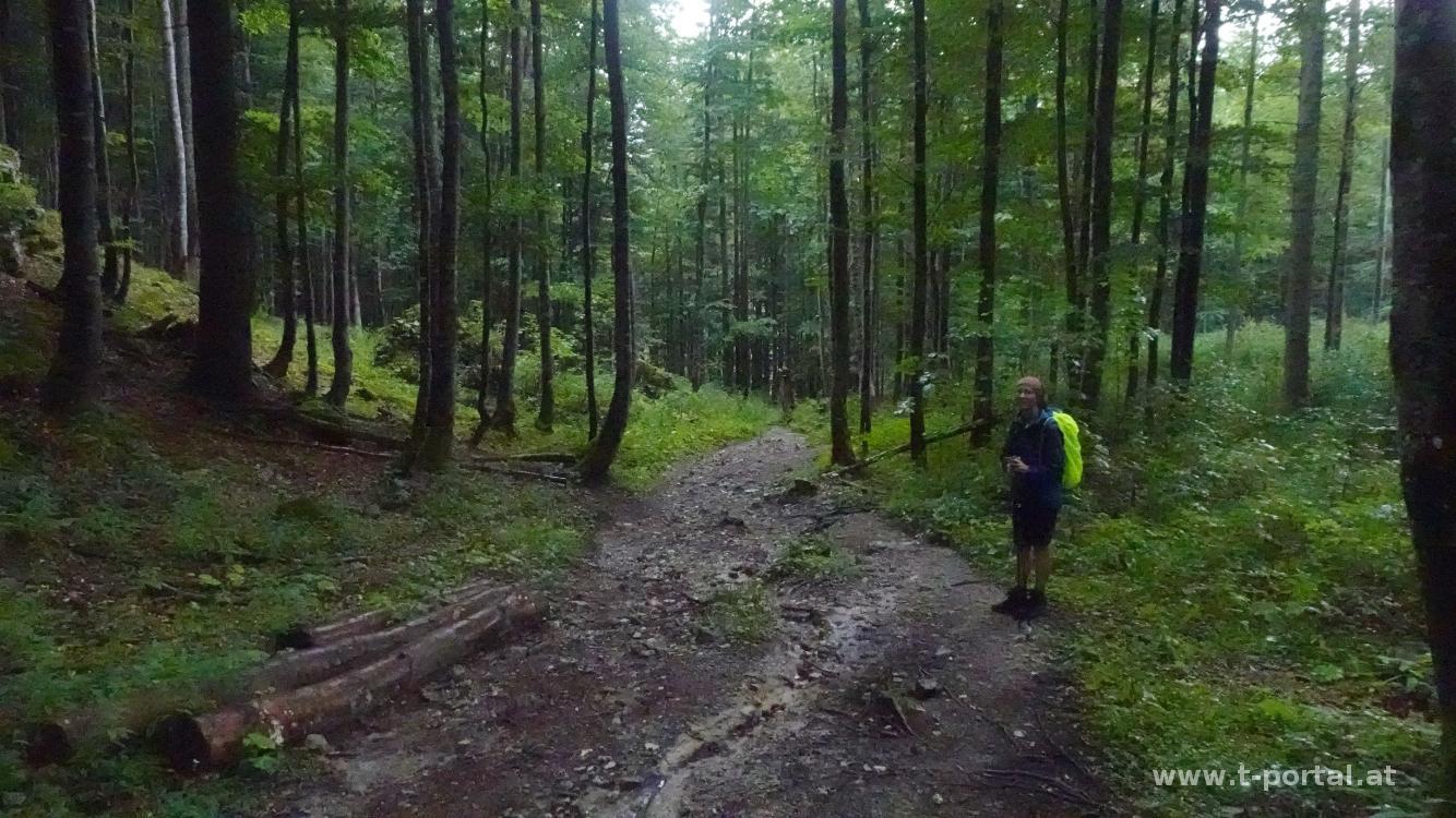 In mehr und weniger Regen und durch Wolken finsteren Wald geht es weiter hinab. Wir queren noch ein paar Mal eine Forststraße und gehen anschließend auf dieser die letzten Minuten zurück zum Ausgangspunkt. Nachdem es noch bis in die Nacht weiterregnet war es heute sinnvoller, nicht auf der Häuslalm zu warten, denn dann wären wir erst mitten in der Nacht abgestiegen.
