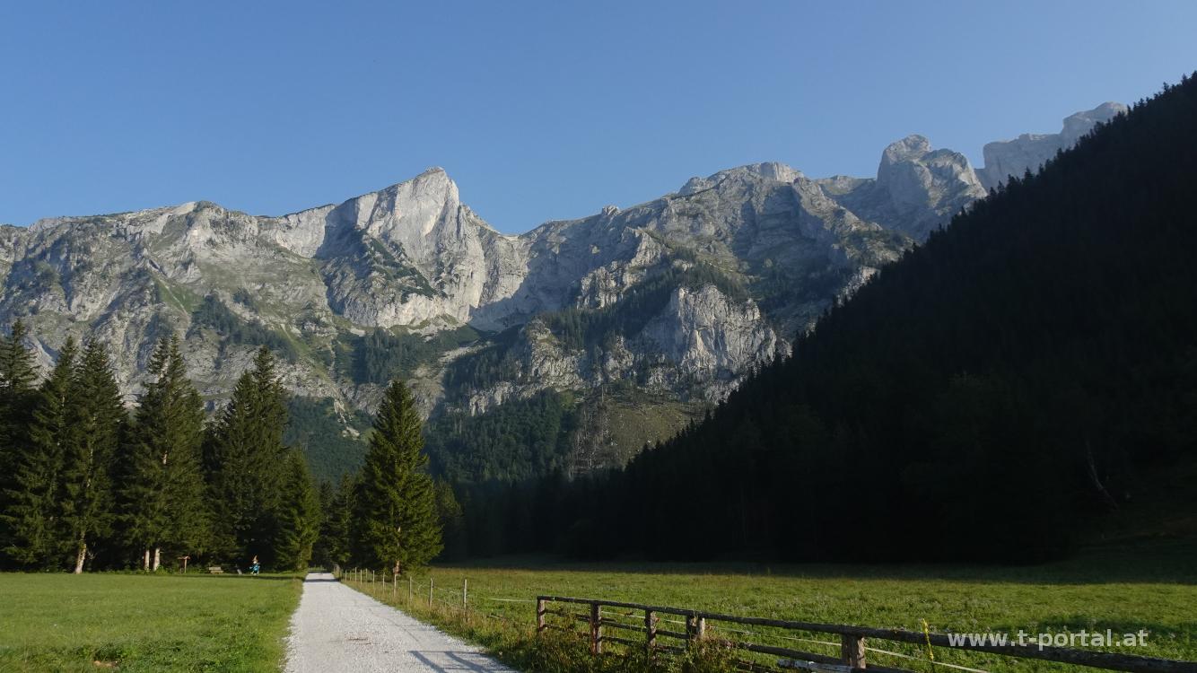 Nachdem wir gestern schon direkt auf den Hochschwab geblickt haben, machen wir uns heute auf den Weg zum Gipfel. Dafür haben wir uns den Weg vom Bodenbauer übers G'hackte ausgesucht. Wir starten am noch recht leeren Parkplatz und wandern auf der Straße in Richtung Felswand. Bei der ersten Kreuzung geht es nach rechts und auf dem breiten Schotterweg weiter aufwärts. Weiter vorne queren wir ein Schuttfeld mit Wasserrinnsalen und danach wird auch der Pfad schmaler. Es geht nun im, teils noch dunklen, Wald weiter hoch. Wir nähern uns der Wand und in der nächsten Kehre machen wir einen kurzen Abstecher zum Schottenkogel mit Ausblick ins Tal. Durch den Wald geht es noch ein Stück weiter aufwärts, dann wird es flacher und wir wandern über die Wiesen der Trawiesalm.