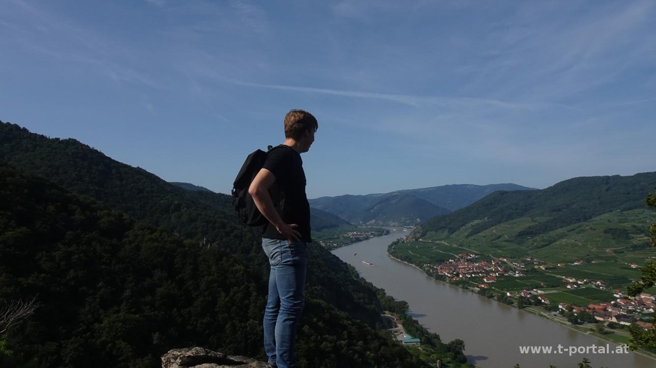 Die Kollegen wollten wieder mal wandern gehen und wir haben uns für eine Runde in der Wachau entschieden. Wir starten unsere Tour bei der Wachauer Nase in St. Lorenz. Von dort geht es einmal über die Bundesstraße und durch den Wald gleich mal hinauf bis zu einem Aussichts- und Gendenkplatz. Nun im Wald flacher dahin bis zu einer Forststraße. Dieser folgen wir nun um Kurven und Kehren immer leicht ansteigend weiter neben Felsen und Bäumen dahin. Die Straße wird zu einem Pfad und nach den nächsten paar Felsformationen biegen wir nach rechts hinab zum Falkenhorst.