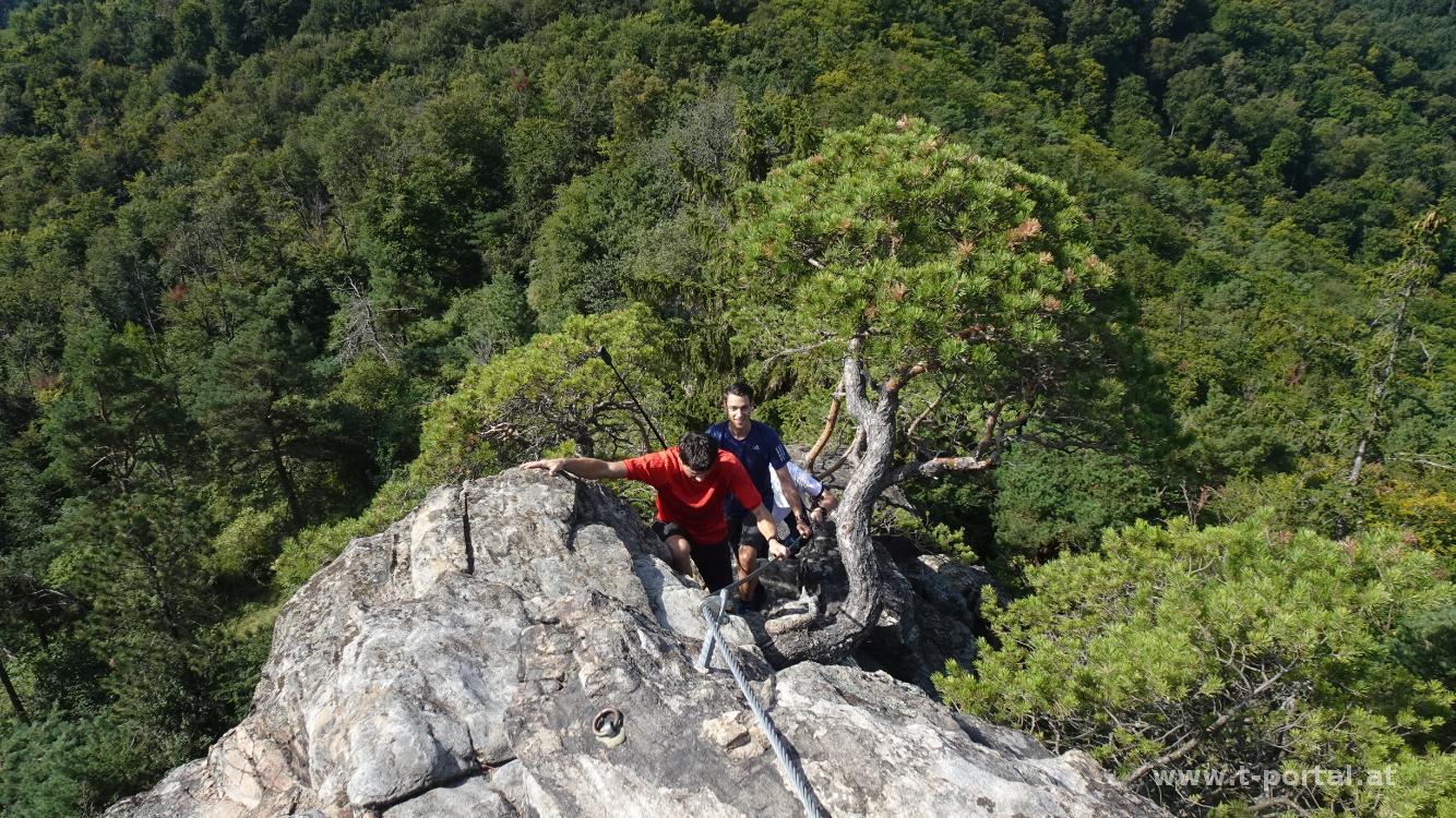 Hier genießen wir kurz den Blick zur Donau und gehen anschließend zurück zum Welterebesteig. Nach etwas auf und ab geht es bald mehr bergan zu einer kleinen Scharte. Nach dem nächsten eher flachen Stück biegen wir zur Hirschwand ab und besteigen diese über den kurzen Klettersteig. Über gemütliche Pfade erreichen wir wenig später den Seekopf und steigen auf die Warte.