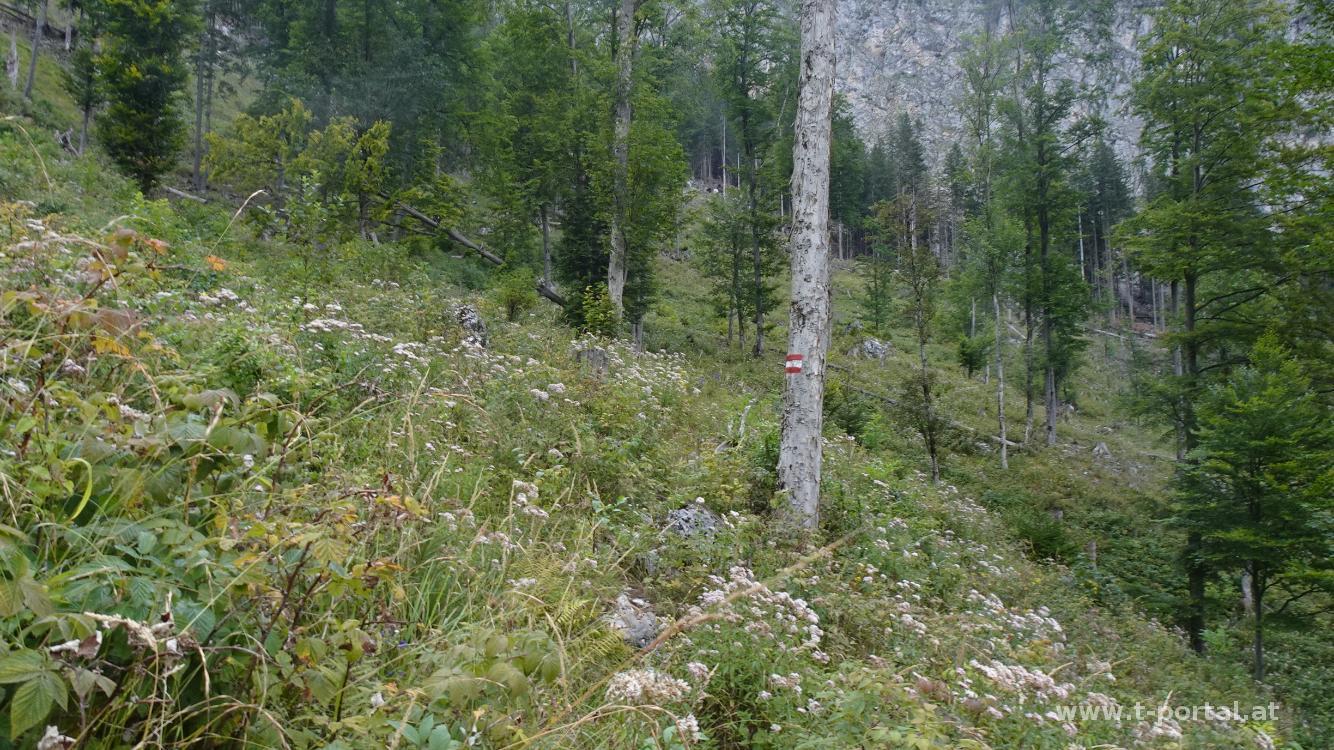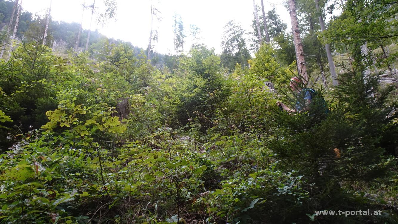 Nachdem wir in der Nähe übernachtet haben, fahren wir heute nochmal nach Hinternaßwald und machen uns auf den Weg zum großen Sonnleitstein. Von dort folgen wir der Straße Richtung Westen vorbei an ein paar Häusern und Obstbäumen. Als die Forststraße einen Knick nach links macht, gehen wir gerade aus weiter. Auf dem anderen Weg werden wir später zurück kommen. Nun geht es neben dem Bach aufwärts und bald wird der Untergrund etwas feucht und verwachsen. Es geht weiter durch Wald, über die Forststraße und eine kurze Holztreppe. Der weitere Anstieg führt nun auf einem ziemlich verwachsenen Wanderpfad steil hinauf. Hier wäre eine Heckenschere praktisch gewesen. Nach dem durchgehenden Anstieg wird es nach einer erneuten Forststraßenquerung flacher, aber kaum weniger verwachsen.