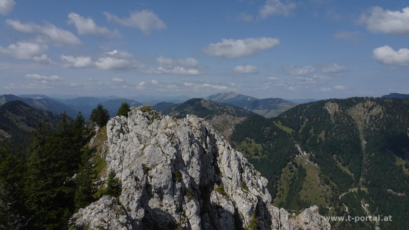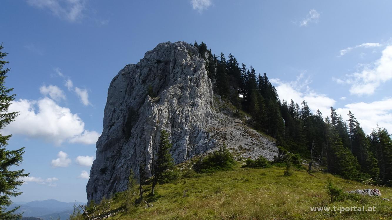 Vorbei geht es am Betriegel und bald in der schrängen Hanquerung nochmal hinauf und dann leicht hinab bis zur nächsten Wegkreuzung. Am Weg hierher treffen wir seit langem wieder eine schwarze Kreuzotter (Höhlenotter), die aber zu rasch verschwindet, als das ich die Kamer zücken kann. Von der Kreuzung geht es nach rechts hinauf und schon taucht der Gipfelaufbau auf. Wir queren südlich davon ein Stück zurück und steigen dann die letzten paar Meter rauf zum Gipfelkreuz. Wir blicken etwas in die Gegend und legen hier auch unsere Jausenpause ein.