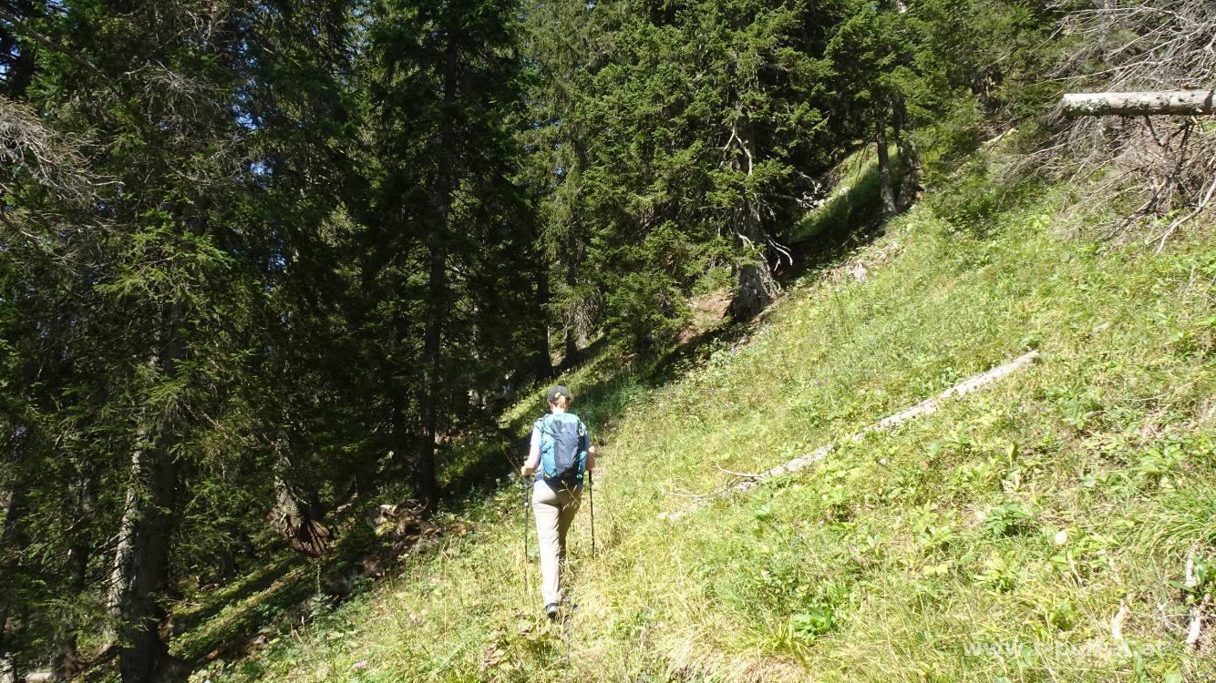 Anschließend geht es das gleichen Weg das Stück zurück zur Wegkreuzung und dann in der Hangquerung weiter. Es folgen einige Kehren, wir queren zweimal die Forststraße und sehen dann bei bei der Forsthütte auf der Ameiswiese. Danach folgt ein feuchter Abstieg neben dem Bachlauf hinunter zur Straße. Auf dieser geht es mit kurzem Abschneider zurück zum Ausgangspunkt.