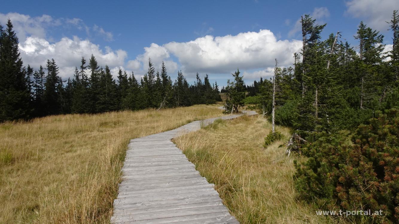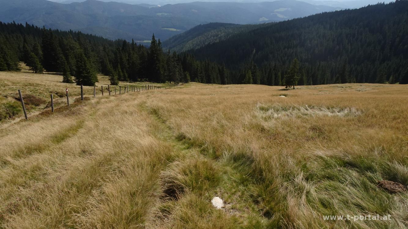 Anschließend geht es noch etwas hinauf und dann hinab zum eingezäunten Hochmoor Schwarzriegelmoos. Hier gibt es einige Tafeln, die über das Moor, Tiere und Landschaft informieren. Mit Blick aufs Stuhleck geht es noch ein Stück weiter, bis ich bei einer Kuhherde nach rechts abbiege und dem Planetenweg abwärts folge.