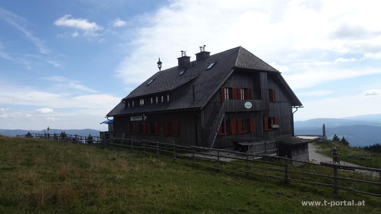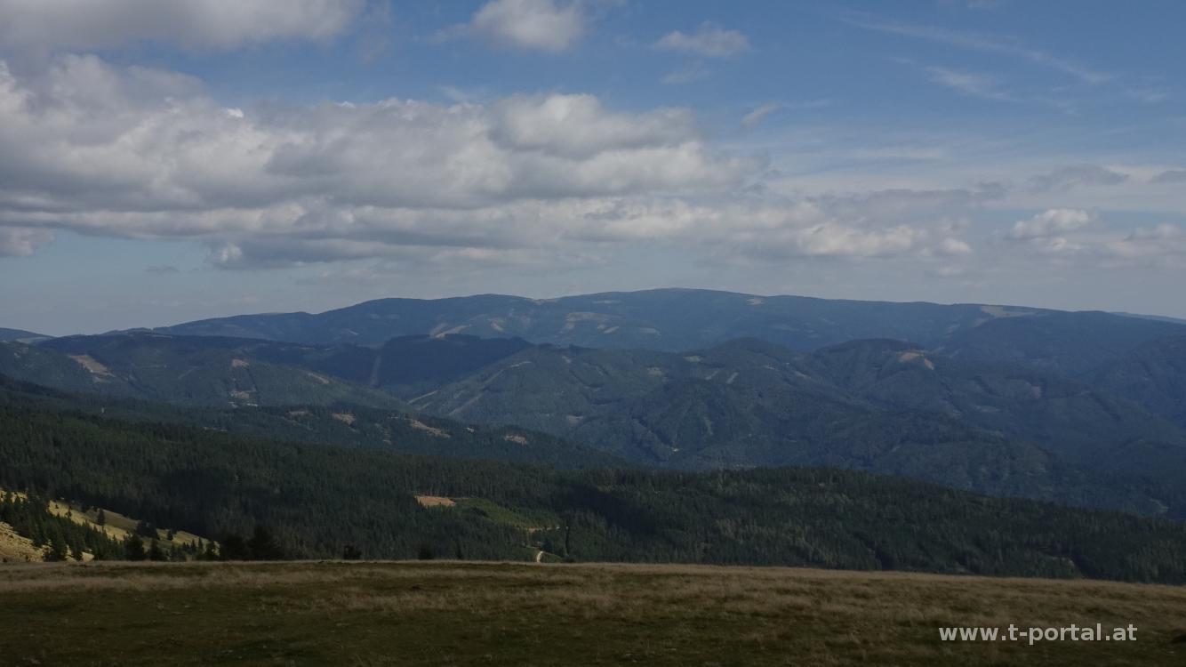 Hinter dem Roseggerhaus geht es über die Wiese zum höchsten Punkt mit der Peter Bergner Warte. Ich blicke zu Rax, Schneeberg, Schneealm und den Wechsel hinter mir und wandere dann auf der Wiese neben den Windrädern auf und ab. In der Nähe des "Grazer Stuhlecks" gibt es Bänke und einen Holztisch, wo ich einen Teil der mitgebrachten Jause verdrücke.