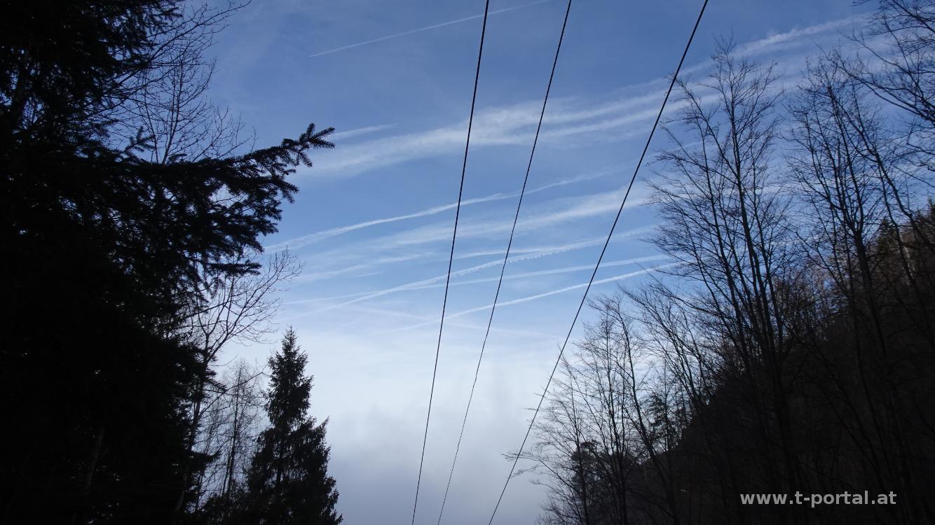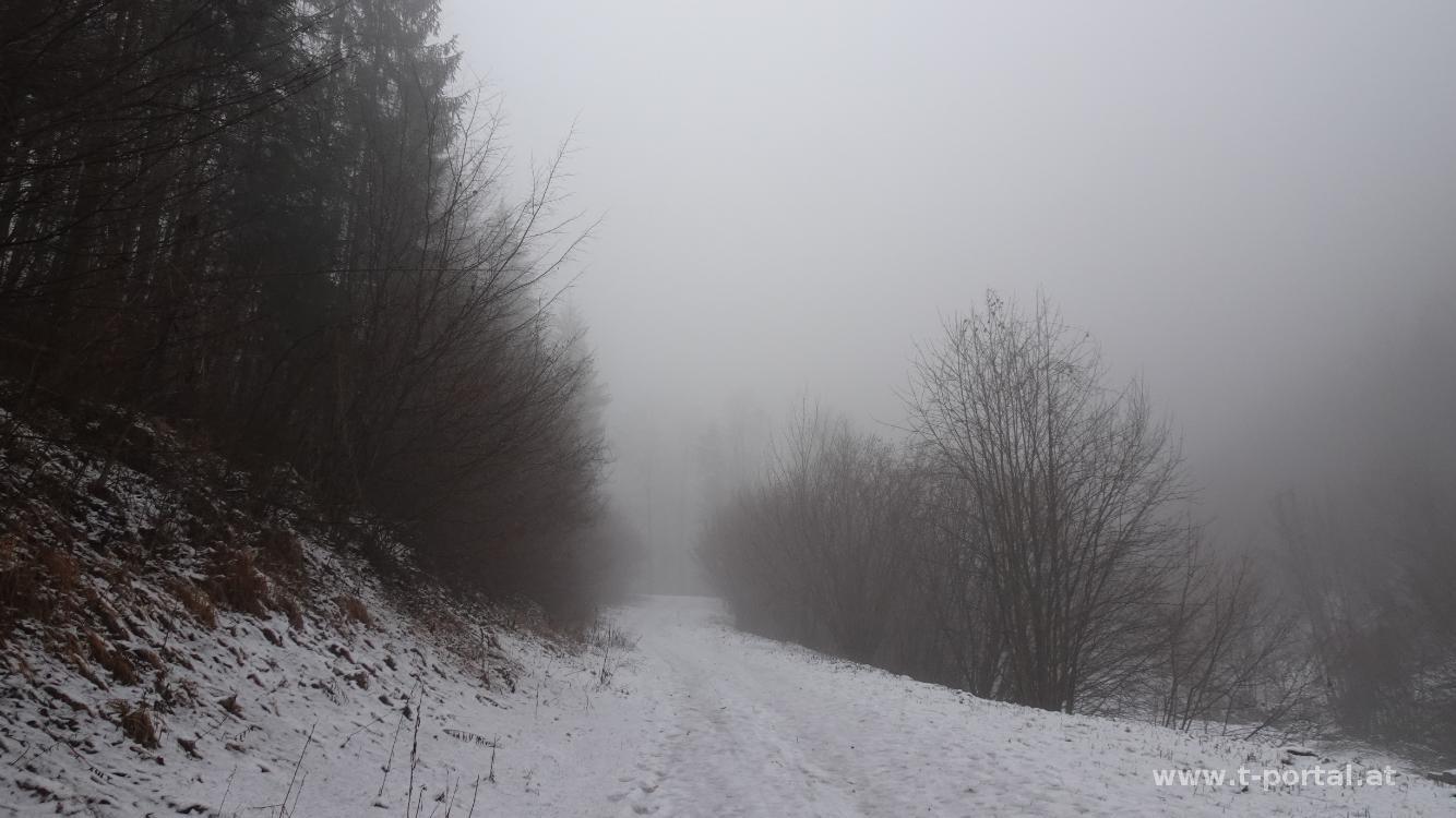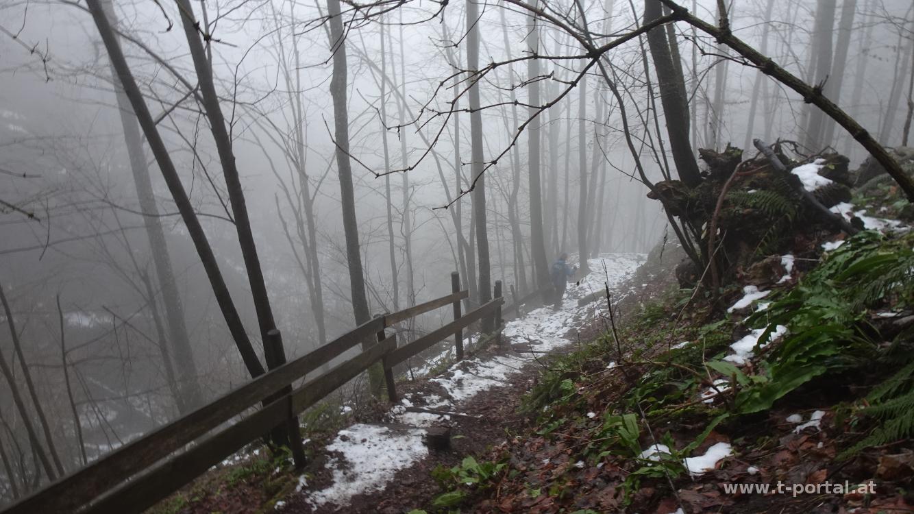 Im Tal hängt der Nebel, weiter oben soll es schön sein. Also machen wir uns auf nach Lilienfeld. Vom Liftparkplatz geht es frostig über den Wasserfallsteig hinauf, wobei der Wasserfall teils gefroren ist. Oben gibt es dann blauen Himmel, aber später auch wieder Wolken. Wir gehen über die Skipiste hinauf, biegen vor der Lilienfelder Hütte ab und wandern über die Wiesen weiter. Nach einem Stück auf der Straße geht es am Direktweg zum Muckenkogel, wo wir eine Jausenpause einlegen.