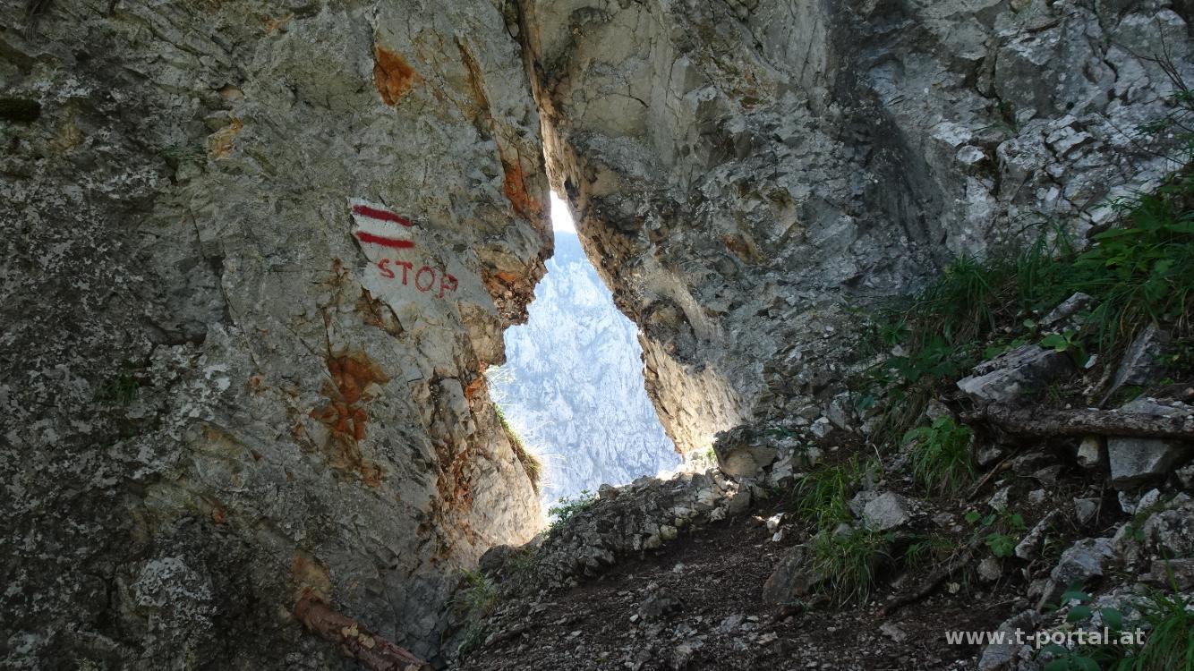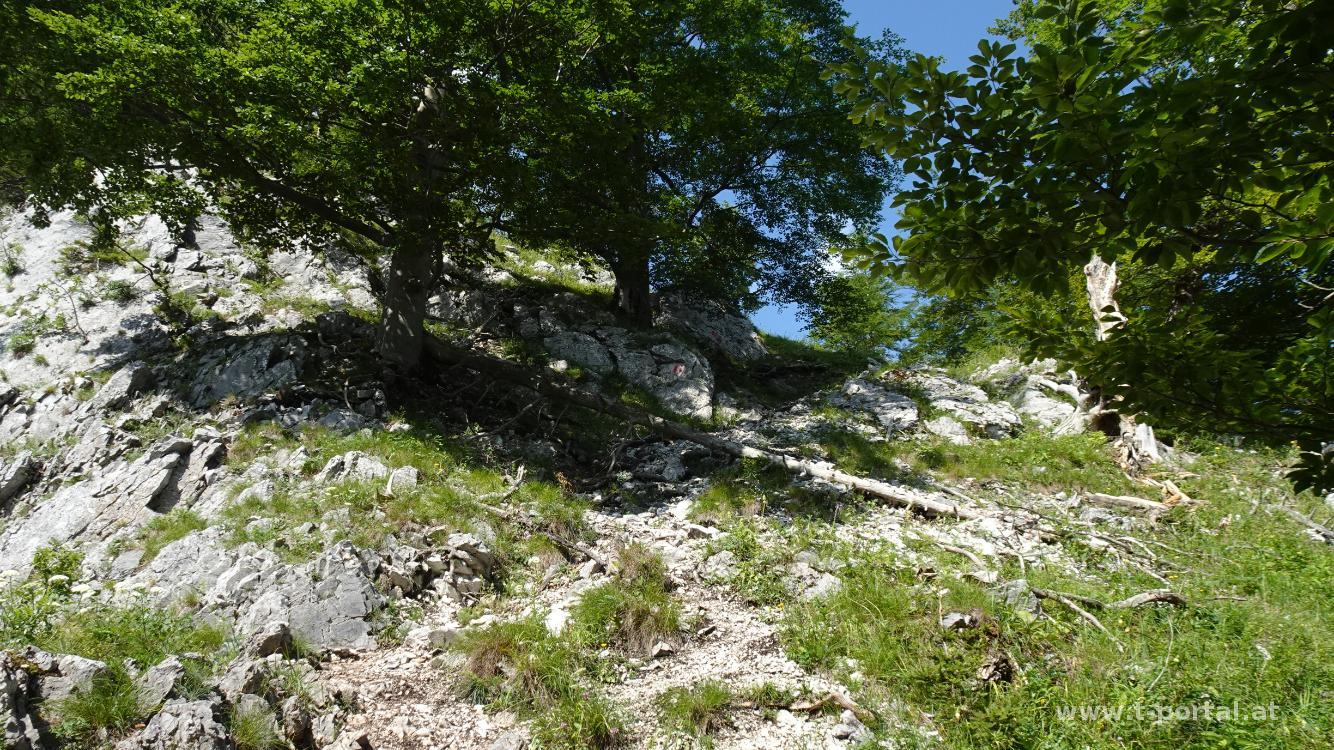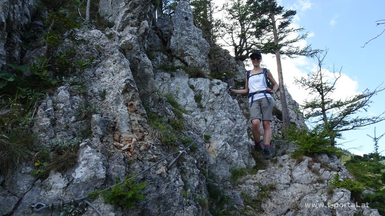 Es gibt ja nicht mehr viele Wanderwege auf der Rax, die wir noch nicht gegangen sind. Einer davon ist der Rudolfsteig. Vom Parkplatz entlang der B27 geht es kurz auf einer Forststraße um zwei Kurven und dann links ab in den Wald. Nun geht es meist steil bergauf und wir gewinnen schnell an Höhe. Nach dem ersten Ansteig durch den Wald gelangen wir in felsigeres Gelände und an manchen Stellen geht es neben dem Weg auch gut hinab. Weiter oben geht es an einem Felsenfenster vorbei und es folgen ein paar Stellen mit Seilsicherung, die bei mehr Nässe vermutlich rutschig sind. Anschließend wird es im Wald etwas weniger steil, dann geht es aber doch nochmal hinauf und schlussendlich erreicht man die Kreuzung mit dem Hoyossteig.