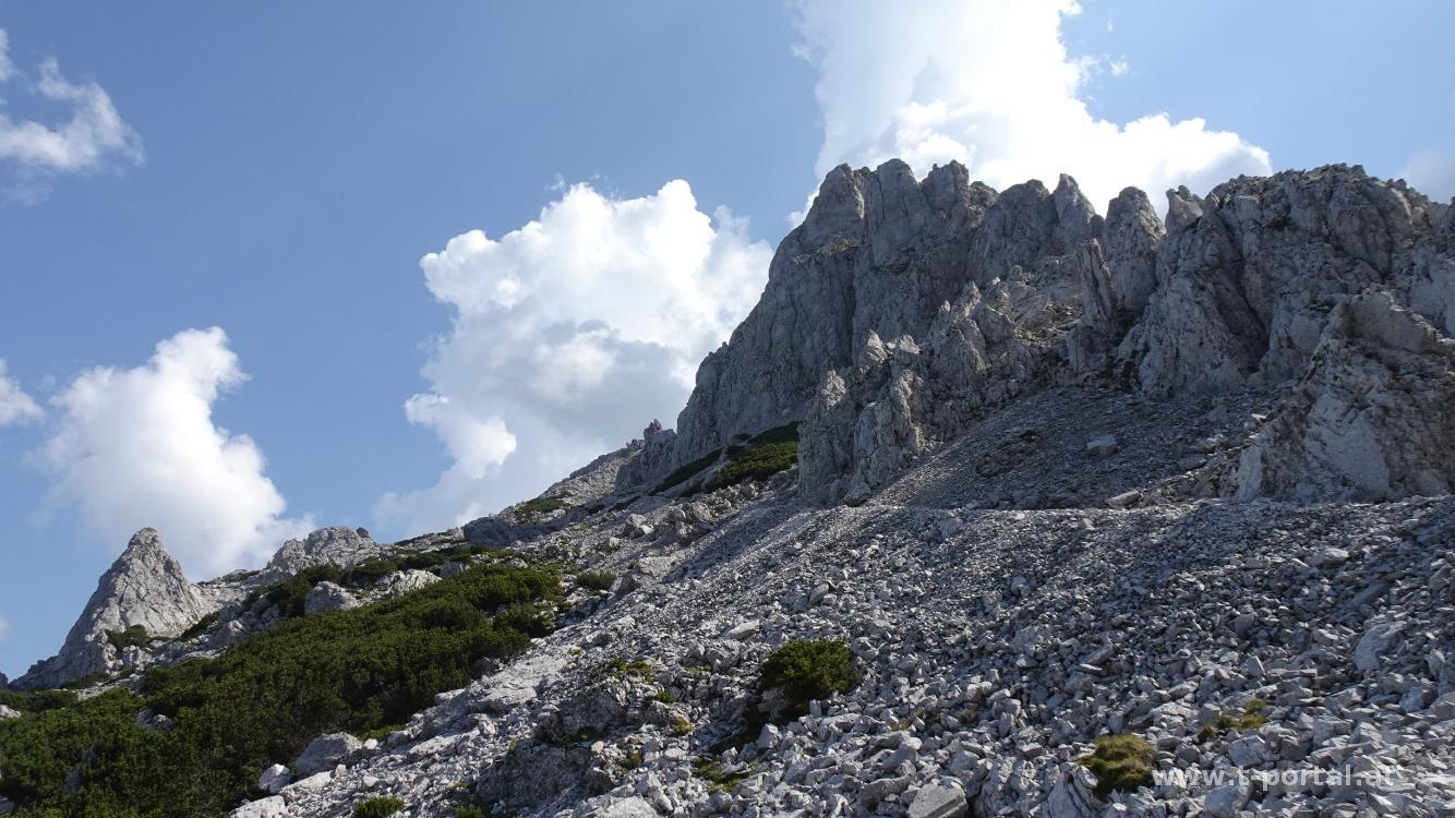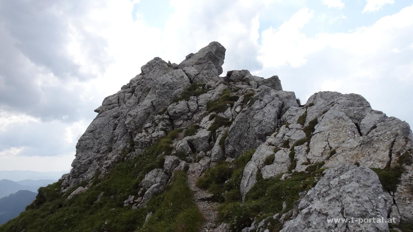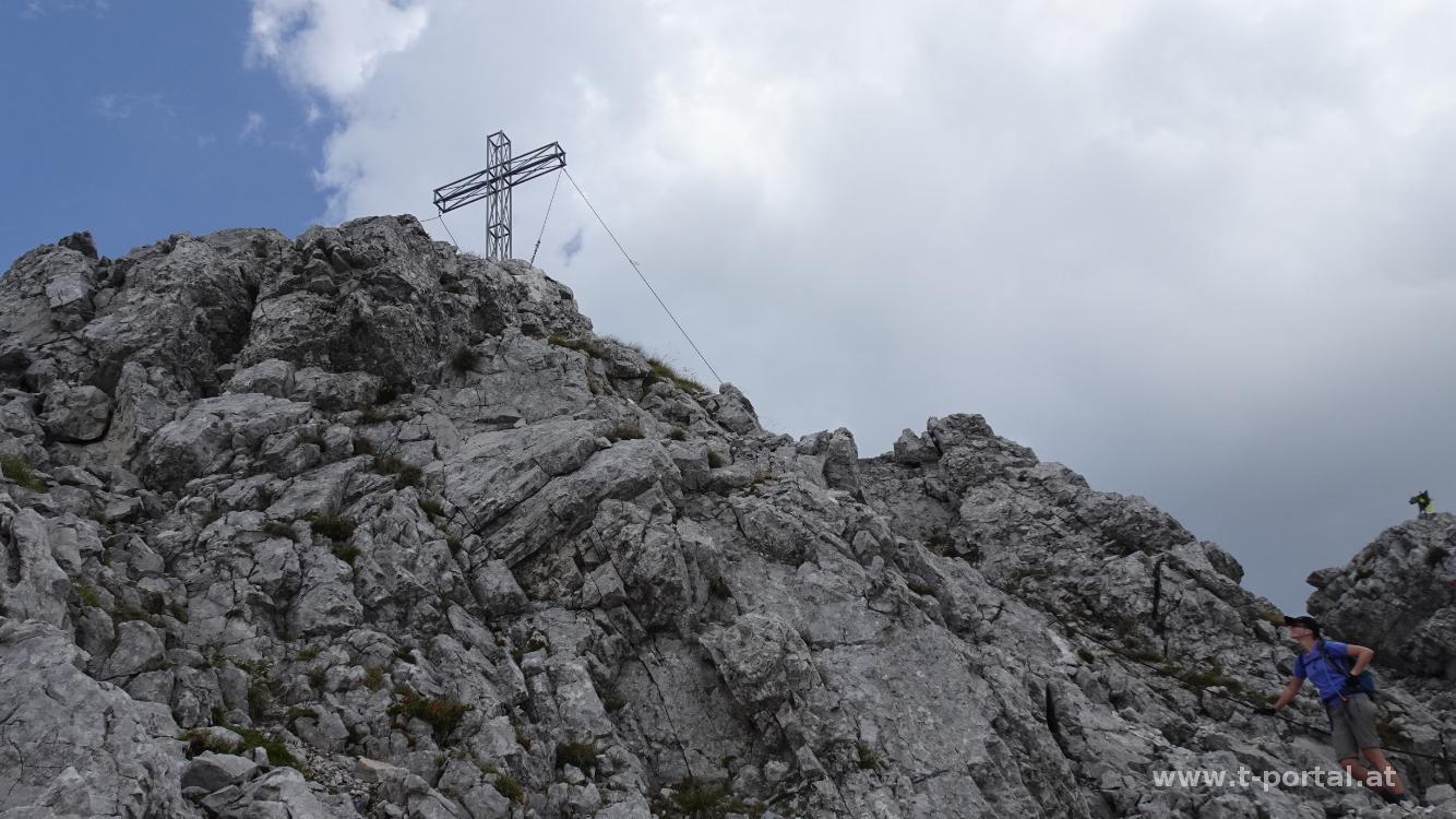 Über Steine und Schotter geht es nun links vorbei an der Felsformationen und immer weiter hinauf. Nach einigem Anstieg wird es flacher und hinten taucht die TAC Spitze auf. Wir wandern über die nächsten Steinblöcke und stehen dann am Beginn des kurzen Klettersteigs (Schwierigkeit A/B). Nachdem gerade einige Leute im Abstieg sind, warten wir kurz und machen uns dann selbst auf den Weg. Zuerst geht es quer hinüber, dann gerade hoch. Anschließend noch zweimal ums Eck und dann ist der schmale Platz beim Gipfelkreuz erreicht. Wir schauen kurz in die Gegend, besuchen dann noch den Platz mit Buch und steigen dann wieder ab. Unten angekommen legen wir unsere Jausenpause ein.