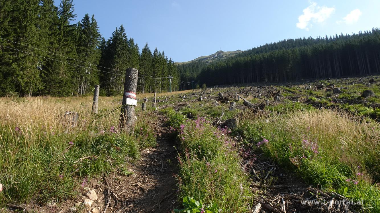 Heute haben wir uns ein Ziel auf der anderen Präbichlseite gesucht. Von unserem Quartier marschieren wir wieder runter zur Passhöhe und von dort rauf zur Talstation des Polsterlifts. Wir nehmen aber nicht den Lift sondern wandern durch den Kahlschlag hinauf zum Wald. Heute sind wir auf der Schattenseite, somit ist es nicht ganz so warm wie gestern. Durch den Wald geht es am Knappensteig hinauf, zu einigen Himbeeren und zur Knappensteig Alm. Wir queren die Wiese, gehen wieder ein Stück durch den Wald und dann über eine schöne Querung durch das Polsterkar. Nach einer kurzen Stelle mit Seilsicherung erreichen wir die Leobner Hütte. Für ein Rast ist es noch zu früh also geht es auf der Forststraße gleich weiter hinauf in den Hirscheggsattel zwischen Polster und TAC Spitze. Unser Weg führt uns nun nach rechts und wird bald steiniger.