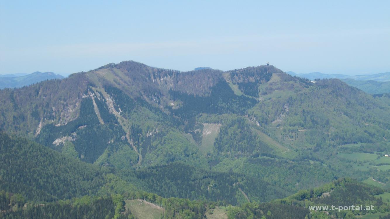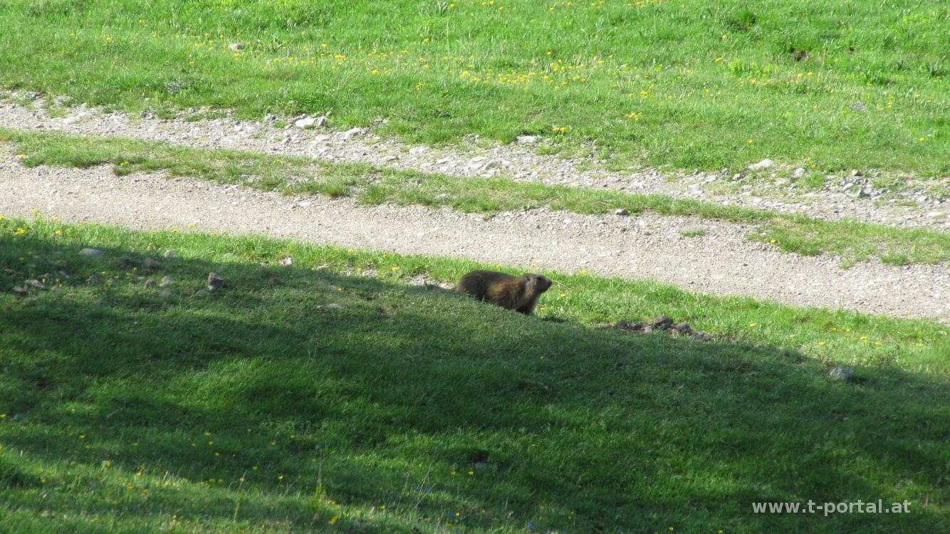 Auf der Kleinzeller Hinteralm (1012m) angekommen treffe ich ausnahmsweise keine Kühe sondern ein Murmeltier. Bisher habe ich immer nur die Bauten gesehen. Um aufs Hochstaff zu kommen geht es noch ein Stück nach Osten weiter und dann unmarkiert auf ausgetretem Weg bergauf. Den genauen Einstieg hab ich zwar verpasst, aber bergauf war ein guter Tipp. Vom Hochstaff (1305m) kann man den Leuten winken, die von der Ebenwaldhöhe Richtung Reisalpe unterwegs sind. Einige davon hab ich später sicher wieder getroffen. Retour zur Kleinzeller Hinteralm am gleichen Weg und wieder hinauf auf die Reisalpe. Hier lass ich mir etwas Zeit, da vor mir eine Frau im gleichen Tempo mit ihrem Hund schimpft, da dieser immer den falschen Weg nimmt. Sowas aber auch! :-)