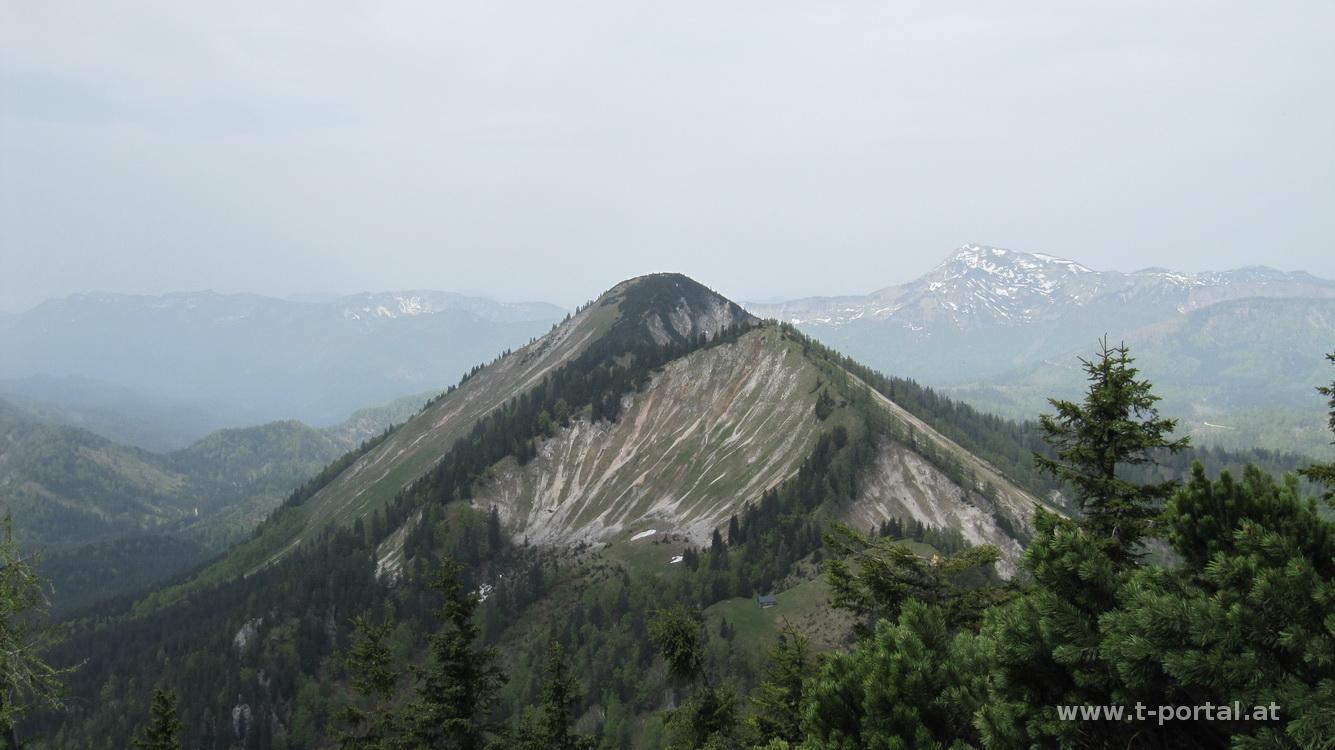 Vom Feldhütlsattel geht es nun bergauf über den Kamm zuerst auf den Hochkogel (1606m), kurz hinunter und dann auf den Vorderen Zellerhut (1628m). Von hier hat man auch schon den mittleren und großen Zellerhut im Blick. Nachdem die Sonne anscheinend im Tal geblieben ist und am Kamm nicht scheint, steige ich ab zum Zellersattel und raste dort. Danach geht es an die letzte Steigung - zuerst zum mittleren (1587m) und dann zum großen Zellerhut (1639m). Auf der ganzen Runde hat man bereits Ausblick nach Mariazell, zur Gemeindealpe, Ötscher, Dürrenstein, Hochkar, Hochschwab, usw.