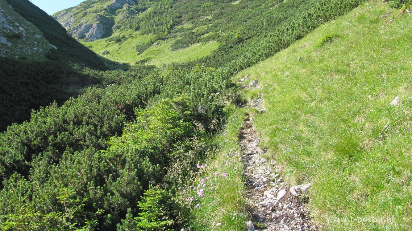 Ich wähle die Route von Niederalpl Ort (970m), die alternative Route würde am Niederalpl Pass (1224m) starten. Parkplatz und Wegweiser gibt es von Mürzsteg kommend nach einer Linkskurve gerade über eine kleine Brücke. Wie letzte Woche ist es noch immer verdammt warm - nachdem ich aus dem Norden rauf geh, hab ich zumindest beim Aufstieg meist Schatten. Die Route führt mich zuerst über Forststraßen und dann über Waldwege ins Rodeltal. Der Weg führt bald zwischen Latschen zu einer kleinen Wegzweigung. Entweder gehts rechts am normalen Weg weiter oder es wird etwas links an einer Seilsicherung und über ein Leiter abgekürzt. Wobei - bei der Menge an Fotos, die ich immer mache, war ich sicher auch nicht schneller.