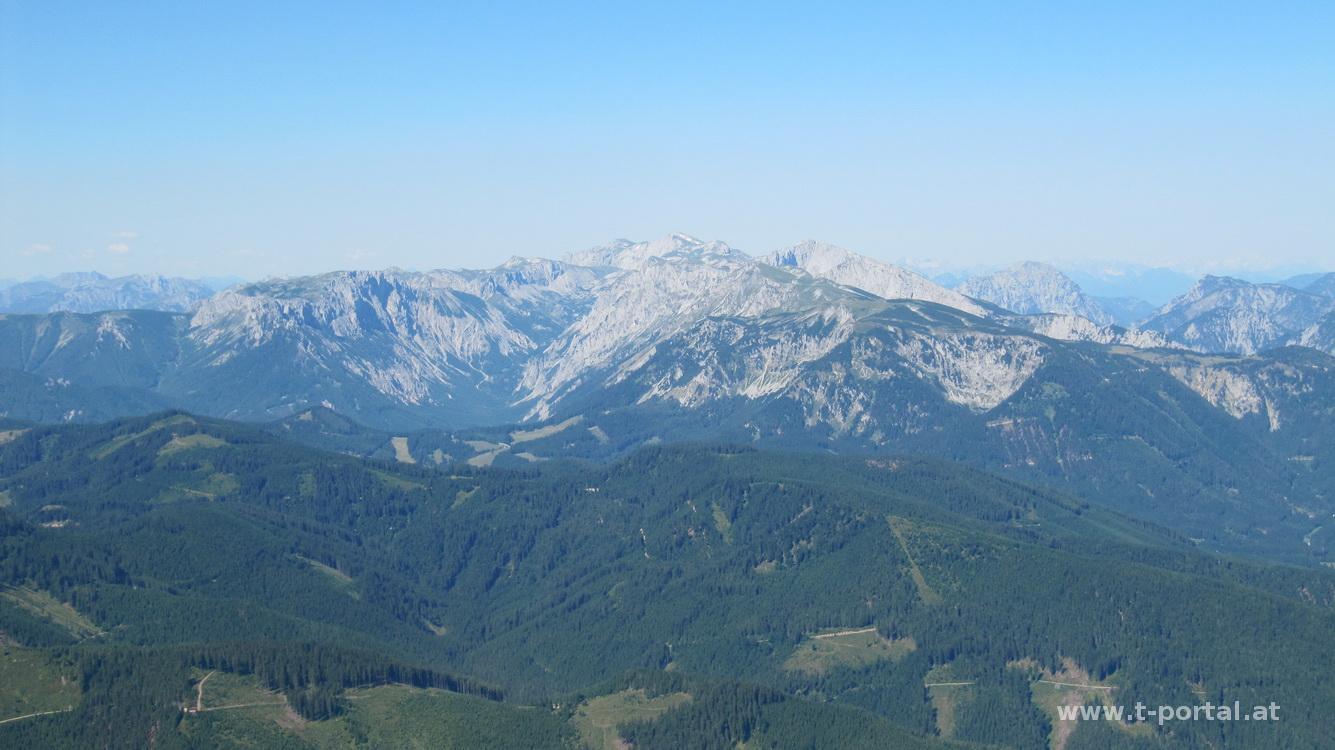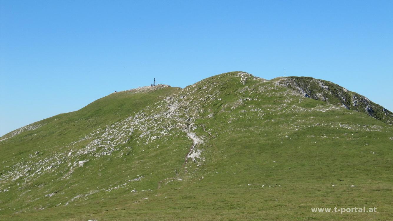 Weiter über die Almwiese blickt man rechts zum großen Wildkamm und gelangt dann zur Gingatzwiese. Der Wegweiser zeigt bereits zum Veitschgipfel und Graf Meran Haus. Nach einigen weiteren Anstiegen hat man das Plateau erreicht und blickt Richtung Hochschwab, Ötscher & Umgebung, der Tonion gegenüber und so weiter. Bald stehe ich am Gipfelkreuz (1981m) und raste eine Runde. Danach wandere ich runter zum Graf Meran Haus auf ein kühles Getränk.