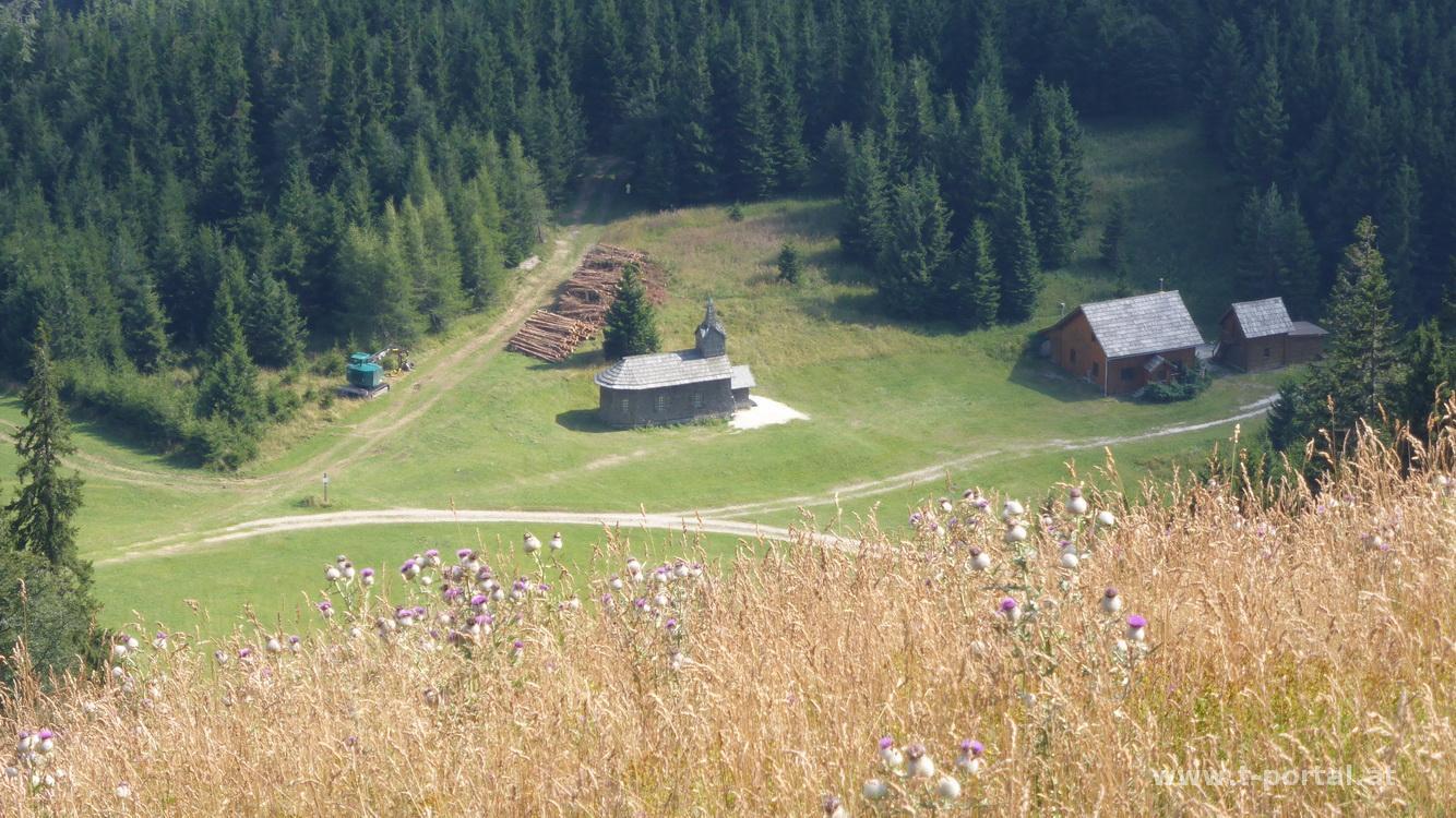 Einige Minuten zwischen Kuhfladen dahin wende ich mich nach einem Gatter nach links und gehe direkt am Kamm zum Gipfelkreuz (1342m). Wie in den letzten Wochen ist es noch immer schön warm, man merkt es auch an den braunen Gipfelwiesen. Das Schutzhaus lasse ich aus und gehe direkt weiter über die Schiwiese, bevor es auf unmarkierten aber ausgetreten Waldweg zurück zum wirklichen Weg geht. Dem Weg hinab durch Wälder sieht man bald den Golfplatz, es geht vorbei an einem Soldatengrab bis ich am Golfplatzgelände ankomme. Hier zwischen tieffliegenden Golfbällen zurück zur Straße und dem Ausgangspunkt.