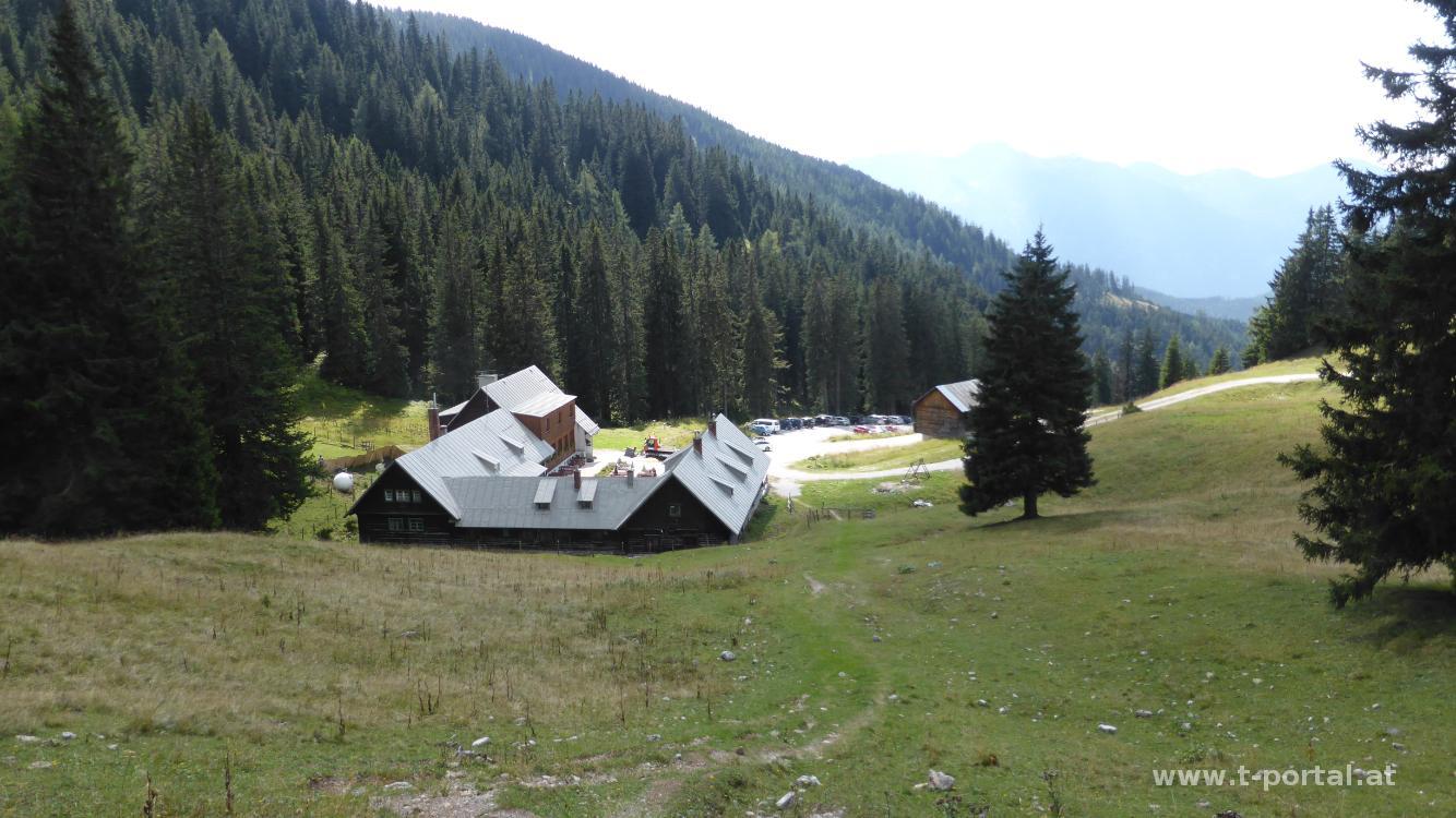 Ich starte meine Runde beim Parkplatz beim Schloss Kaiserau. Alternativ könnte man die Mautstraße bis zur Oberst-Klinke-Hütte nehmen, ich erledige das zu Fuß. Von der Kaiserau geht es neben einem Bachbett und einigen Kühen durch den Wald. Bereits beim Start hat man Kalbling und Riffel im Blick. Man quert die Forstraße und nach einem Anstieg über die Wiese bin ich nach ca. 45 Minuten bei der Oberst Klinke Hütte. Ich folge dem Wegweiser Richtung Kalbling, der zuerst leicht rechts hinter der Hütte hinauf geht. Bei der Abzweigung zur Mödlinger Hütte gehts es nach links weiter und über eine steilere Wiese Richtung Stein und Fels.