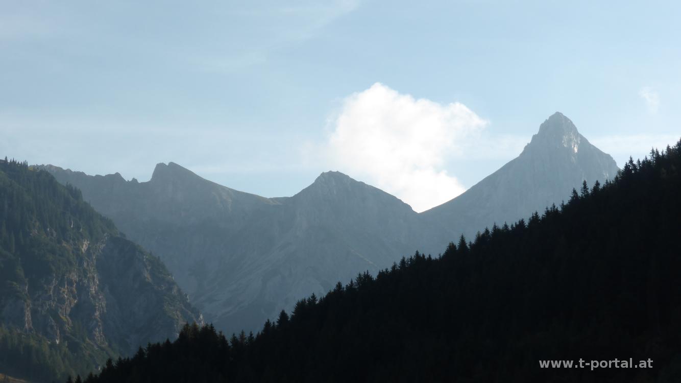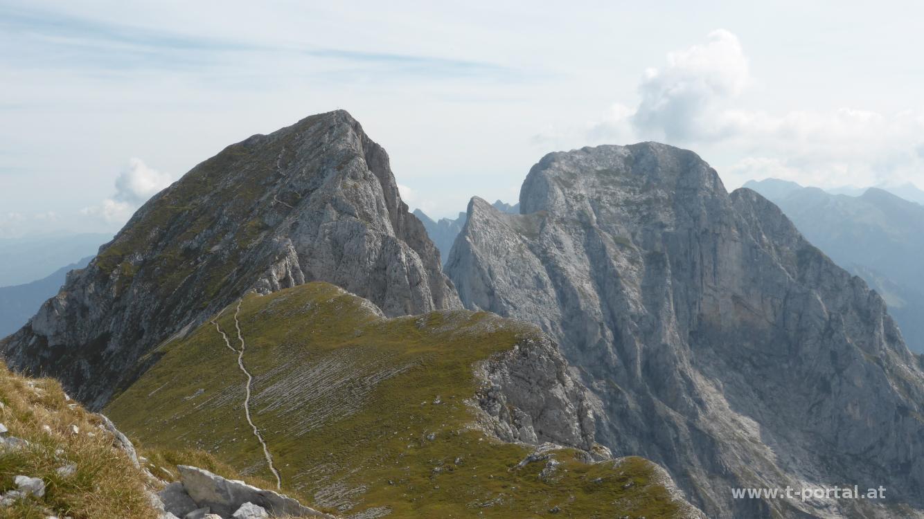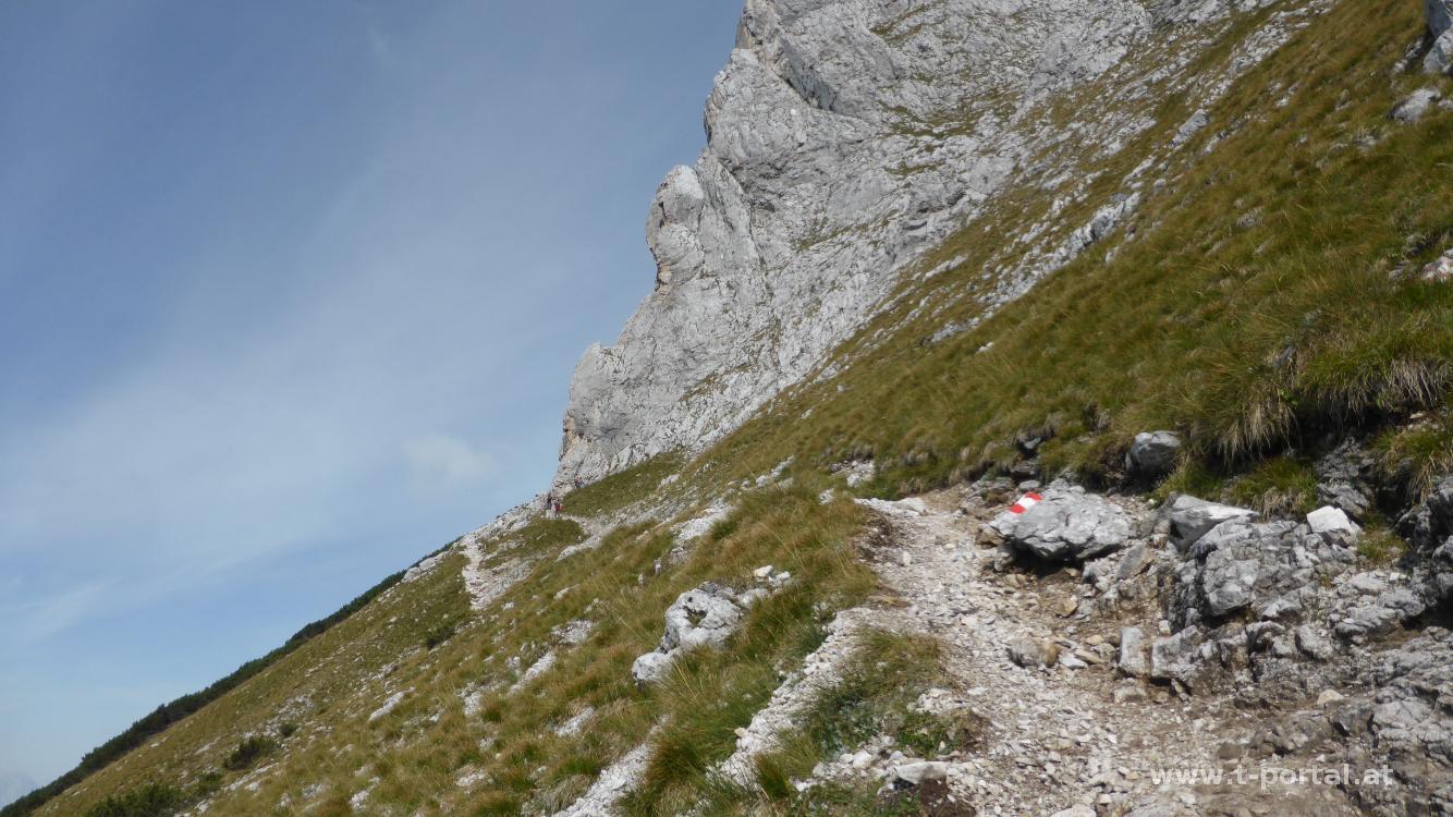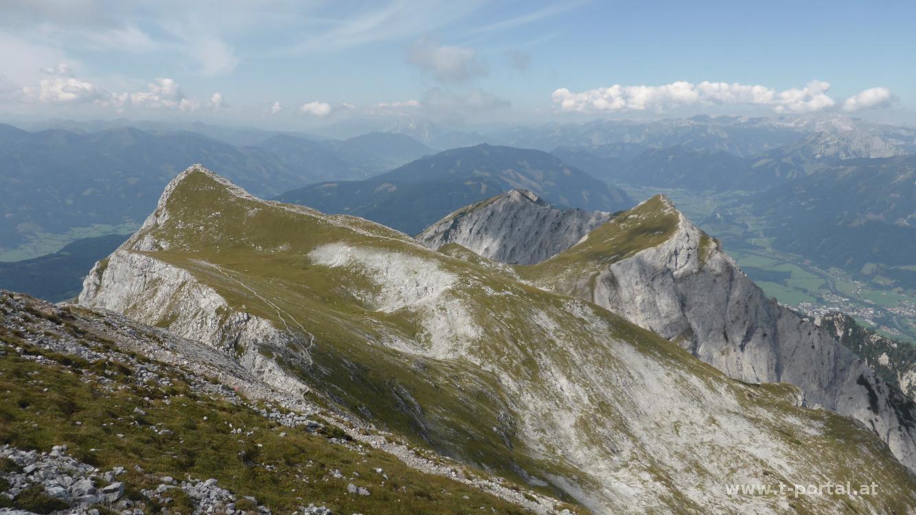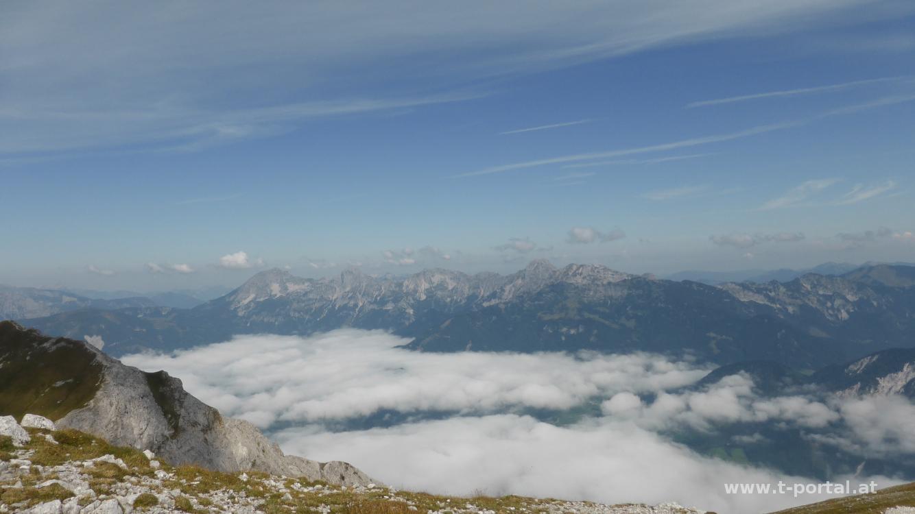 Nun geht es zuerst rechts bergan, bevor man nach links kehrt und unterhalb der Kalblingwand weiter wandert. Zwischendurch seh ich ein paar Kletterer und den Dachstein am Horizont, während im Tal noch die Wolken hängen. Nach Umschreitung der Wand gelangt man zur Kreuzung Richtung Riffel und Kalbling/Sparafeld. Ich wende mich nach rechts und nach einigen Kehren über Stein und Wiese hab ich Ausblick zu den Gipfeln von Sparafeld und Kalbling. Wenig später steh ich am Kalbling und habe ein schönes Panorama über die weiteren Ziele. Ich kann sogar prüfen, ob mein Auto noch am Parkplatz steht.