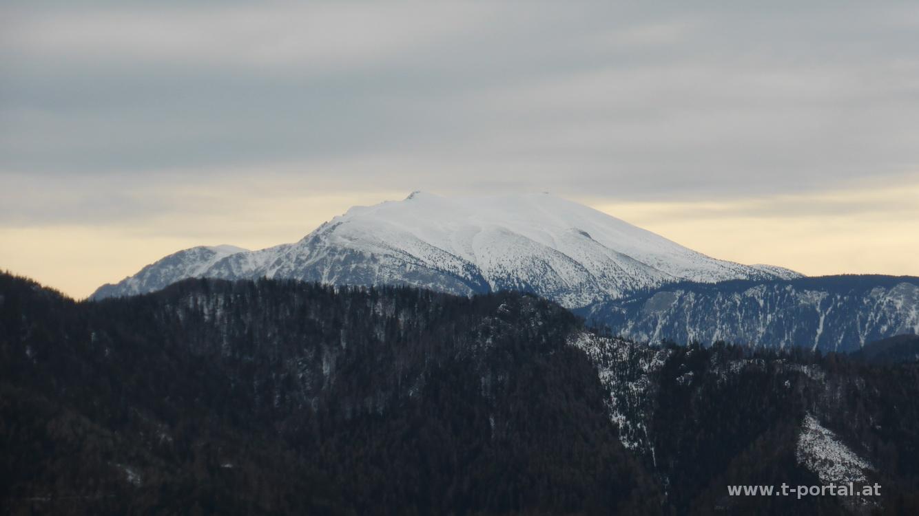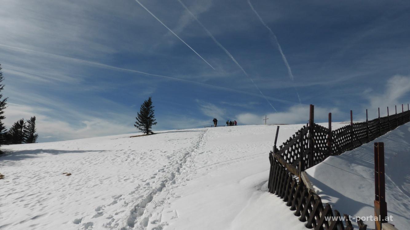 Nach einigem Auf und Ab komme ich zur Kleinzeller Hinteralm. Mir kommt der erste Wanderer des Tages entgegen, der hat die Schneeschuhe am Rucksack - ich frag mich ob ich die auch bräuchte. Für den weiteren Aufstieg ab der Hinteralm nehm ich nun doch die Wanderstöcke zur Hilfe. Immerhin hab ich extra Schneeteller besorgt :-). Von nun geht es auf einer ganz gut ausgetreten Schneespur bergan, geht auch ohne Schneeschuhe ohne Probleme. Nach der Almwiese im Wald ist wieder weniger Schnee, bei der steileren Wiese vorm Gipfel natürlich wieder mehr. Ich nehm trotzdem die ziemlich direkte Linie und stehe nach ein paar mal Schnaufen auf der Reisalpe.
