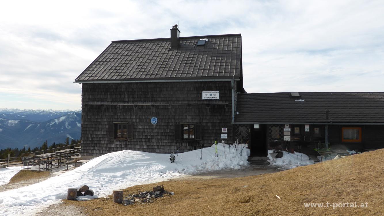 Ich hab einen beeindruckenden Rundblick, wenn mich nicht alles täuscht müssten das am Horizont die Gesäuseberge, Hochkar und das tote Gebirge sein (abgesehen von den bekannten Schneeberg, Rax, Schneealpe, Gippel, Göller, Gemeindealpe und Ötscher). Praktischerweise hat das Schutzhaus auch geöffnet (offiziell erst ab Anfang Mai), das nützte ich für eine gemütliche Mittagsrast. Anschließend noch ein Gipfelfoto und wieder retour Richtung Hinteralm. Beim Abstieg muss ich mehr aufpassen als bergauf, entweder neue Spur im tiefen Schnee ziehen oder am ausgetreten Weg nicht wegrutschen.