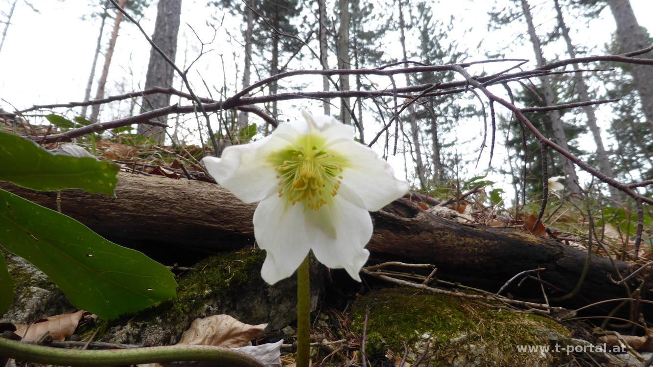 Nach ein paar Minuten auf der Asphaltstraße zeigt die blaue Markierung Richtung Kleinzeller Hinteralm, Gehzeit zur Hinteralm hier mit 2,5h, zur Reisalpe mit 3,5h angegeben. Alternativ führt der grün markierte Weg auf die Ebenwaldhöhe. Ich folge also der blauen Markierung und dem Waldlehrpfad. Die Sonne lässt sich anfangs nur zeitweise blicken, aber mir wird trotzdem bald warm. Nach einigen Höhenmetern im Wald geht es zwischendurch über Wiesen mit letzten Schneeresten. Anschließend wieder weiter auf einem Waldweg, bis ich diesen verlasse und auf eine Forststraße einschwenke. Von hier wunderbarer Blick zum Schnee- und Unterberg. Auch die Sonne kommt langsam hervor. Weiter auf der Forststraße geht es nun immer wieder über Schneefelder, zu denen noch keine Sonne vorgedrungen ist. Eine Person dürfte hier heute schon hochgegangen sein, die anderen wenigen Spuren sind schon ziemlich verblasst.