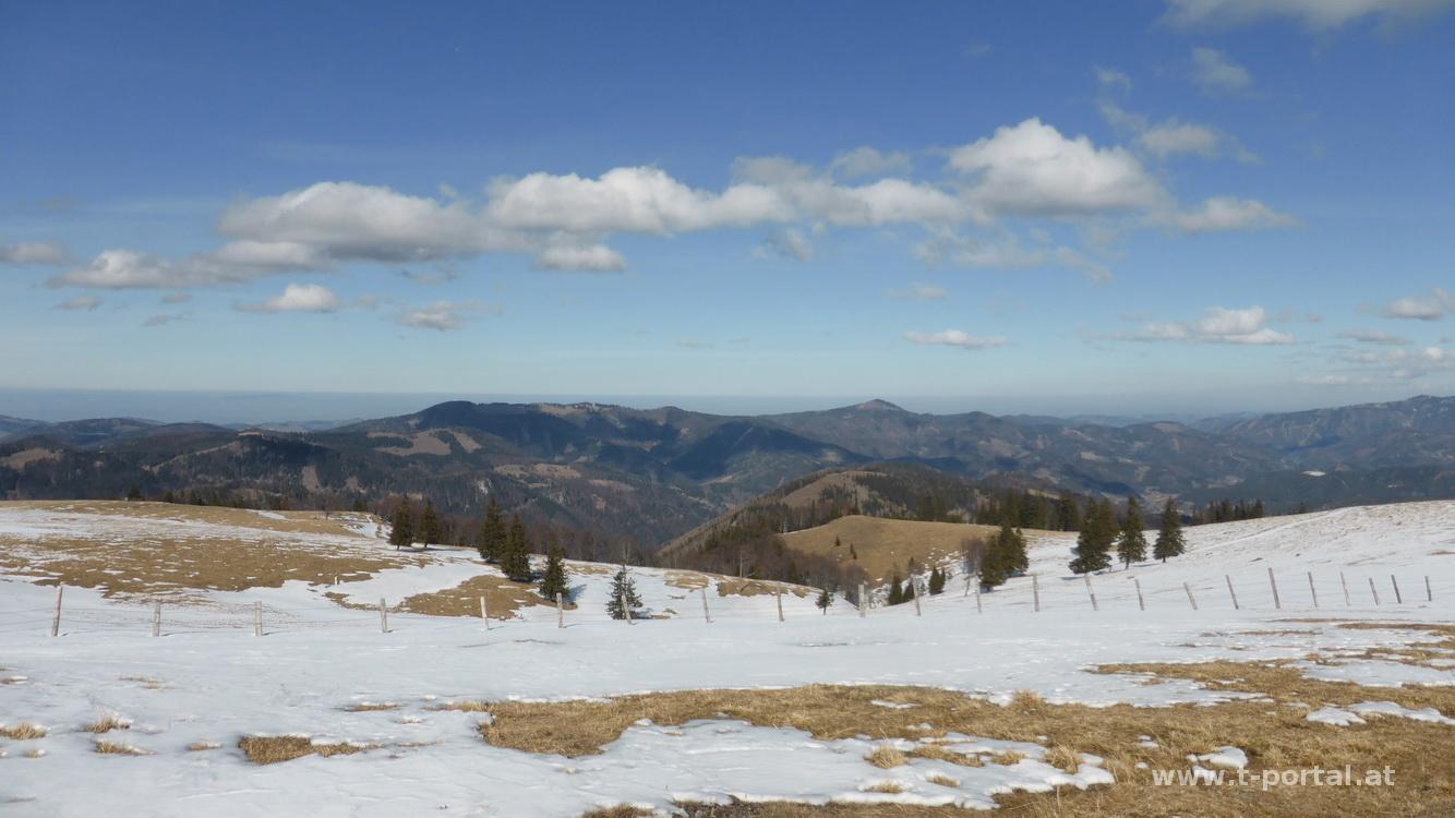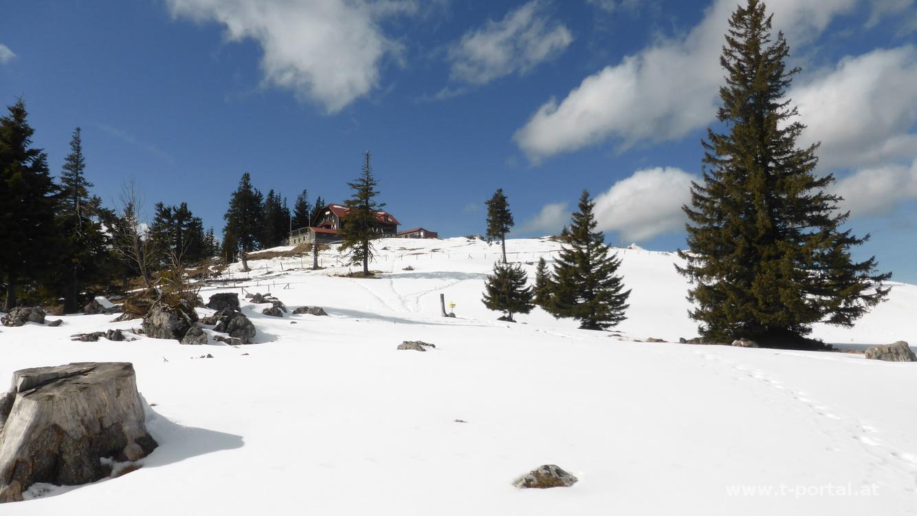 Auf der Hütte angekommen stärk ich mich erstmal, bevor ich noch rüber zum Gedenkkreuz schaue. Nun zurück zum Weg und über Schnee Richtung Türnitz. Es geht mehr oder weniger flach dahin. Später entscheide mich für den Sommerweg, der mich nach Abstieg durch den Wald auf eine Forststraße führt. Diese ist aber nach ein paar Metern auch schon wieder zu Ende und es geht im Zick-Zack runter zur Bergrettungshütte Österleinbrunn. Nachdem am Bankerl die Sonne scheint, mach ich nochmal eine kurze Rast. Nun geht nochmal etwas bergauf und dann über Almen und zwischen ein paar Bäumen dahin, bis ich nach Abstieg bis auf ca. 900m auf eine verfallene Hütte treffe. Hier gibt es eine direkte Abzweigung nach Türnitz. Ich geh jedoch noch, vorbei an der neuen Teichhütte, rauf zum Eibl Gipfel. Hier verbrauch ich die restliche Verpflegung und geh die direkte Route über die Schipiste zurück zum Ausgangspunkt. Anschließend hol ich noch mein Rad und mache mich auf den Heimweg.