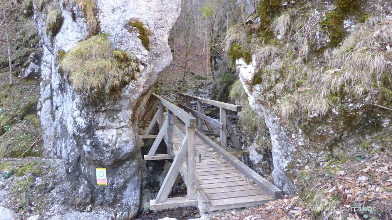 In der Schlucht geht man über einige Steige, quert ein paar Mal das Gewässer und blick hohe Felswände empor. Nach ca. 600 Metern ist der Spaß vorbei und man landet auf einer Forststraße. Wenn man hier schon genugt hat, wendet man sich einfach nach links und geht zurück ins Tal. Ich mache eine kurze Rast und folge der Straße. Nachdem ich vom letzten Mal noch weiß, das hier eine ziemliche Schlaufe auf mich zukommt wende ich mit nach wenigen Minuten in den Wald und kürze diese auf direkten Weg ab. Anfangs ist das auch noch kein Problem, die letzten Meter lande ich unter einer Felswand und muss ein wenig suchen, bis ich einen halbwegs passablen Anstieg raufkraxel. Wäre wohl einfacher gewesen noch ein Stück weiter zu gehen und dann abzukürzen.
