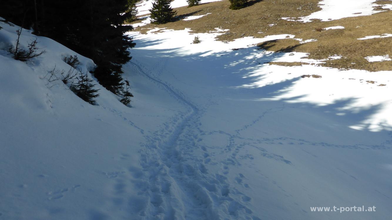 Weiter geht es auf der Forststraße über ein paar Schneereste, bis man auf den Normalweg triff (dieser führt rechts durch ein Tor ins Tal). Nun mit Schneeberg, Gippel und Göller im Rücken weiter am Lackenkogl vorbei Richtung Tirolerkogel. Es geht nochmal kurz hinunter in den Schatten in dem sich noch etwas mehr Schnee hällt, bevor der letzte Anstieg auf die Gipfelwiese erfolgt.